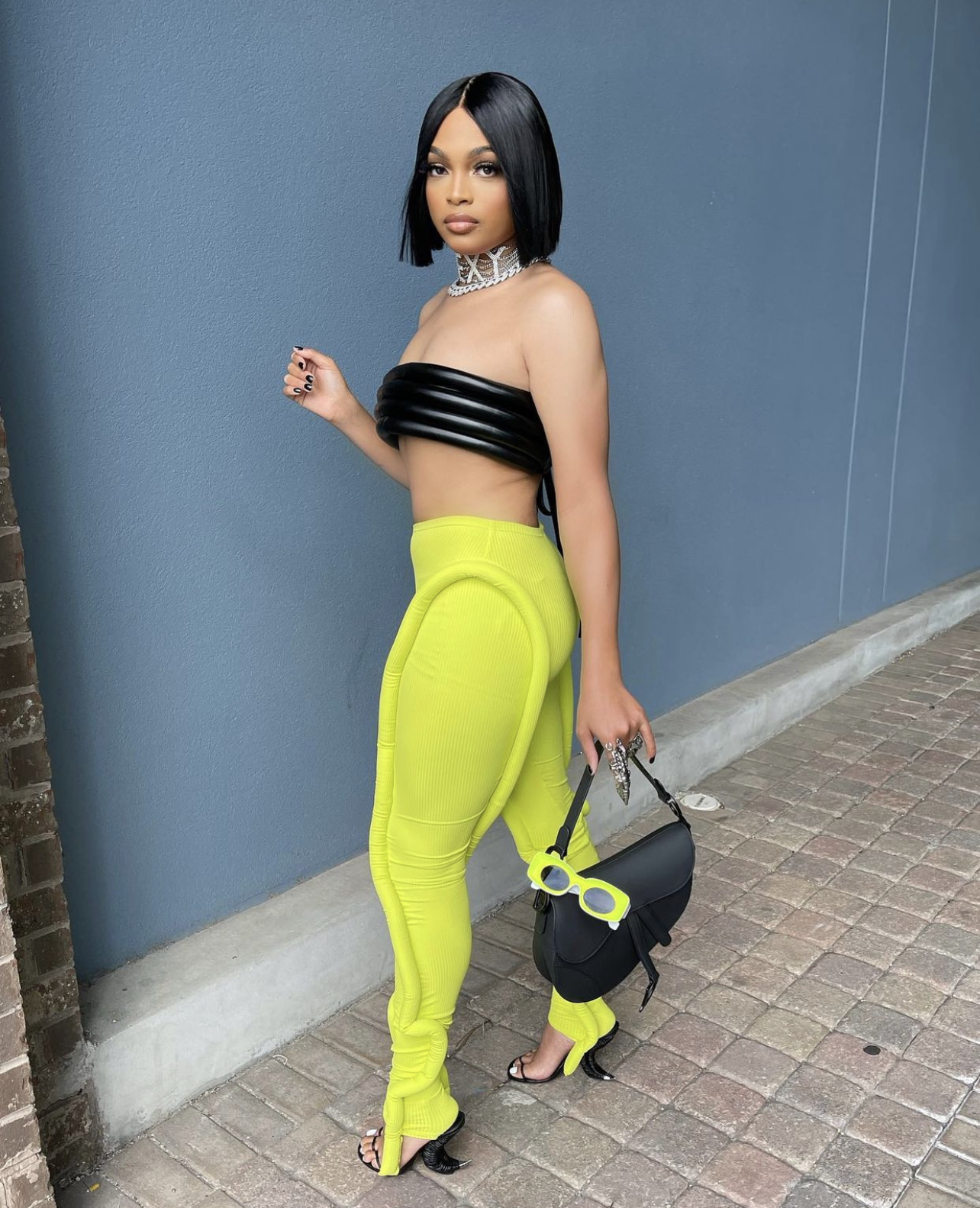 Alonzo Arnold stepped out in a head-turning look by TLZ L’Femme including the brand’s $178 Tube Bandeau Top (unavailable in black) and $238 Tube Citron Leggings. While designer Aazhia Rhy has always been seen as a forward thinker in the fashion game, she decided to take her Juice ’21 collection out of this world with its futuristic silhouettes and design elements. The Tube Cutron Leggings appear in a popping citrus green colorway complete with an eye-catching tube detail that runs from the front of the garment down to the back.