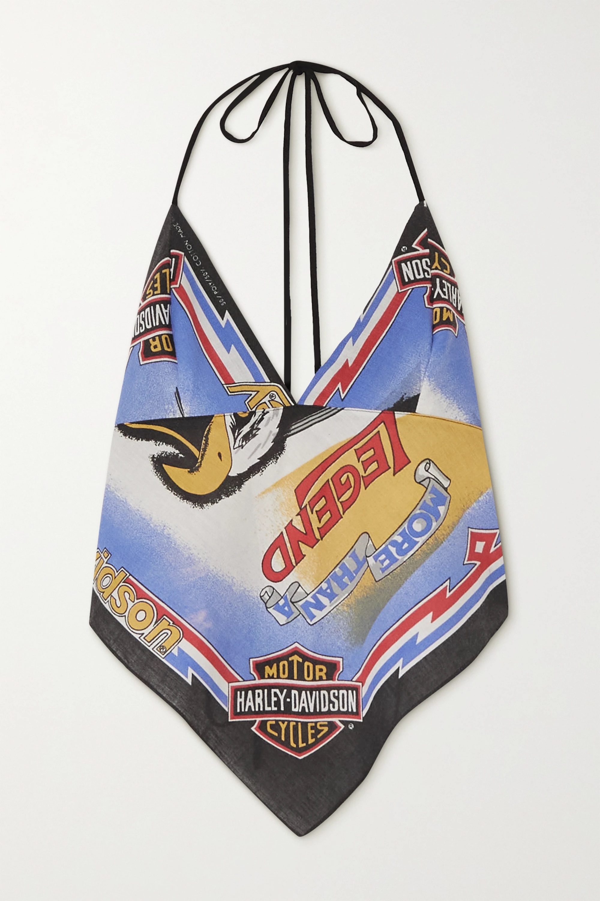 Rihanna stepped out for the night in a $341.74 Conner Ives reconstructed Harley Davidson halterneck top. The bandana style top is made of a cotton-blend voile complete with a self-tie detail on the back and graphic from the remnants of Harley Davidson Motorcycle tee. She pairs the edgy top with a pair of $1,850 Balenciaga slashed loose fit pants, sagged to expose her Raf Simons Patch Detail Checked Boxer Shorts (sold out). The “Work” artist also wore the same Raf Simons boxer shorts with a distressed Balenciaga stripe blue shirt during a recent outing with A$AP Rocky.