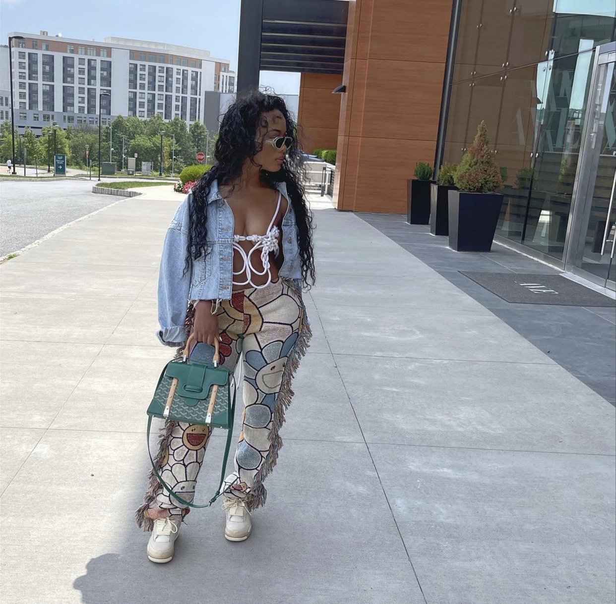 Tapestry apparel has been a huge trending item in streetwear with the knit design appearing on garments such as pullovers, hoodies, pants, and shorts. The designs for the items are endless as celebrity faces, TV and movie characters, and even luxury-inspired logos have graced tapestry pieces. Draya Michele decided to join in on the trend by rocking these immensely popular pants.
