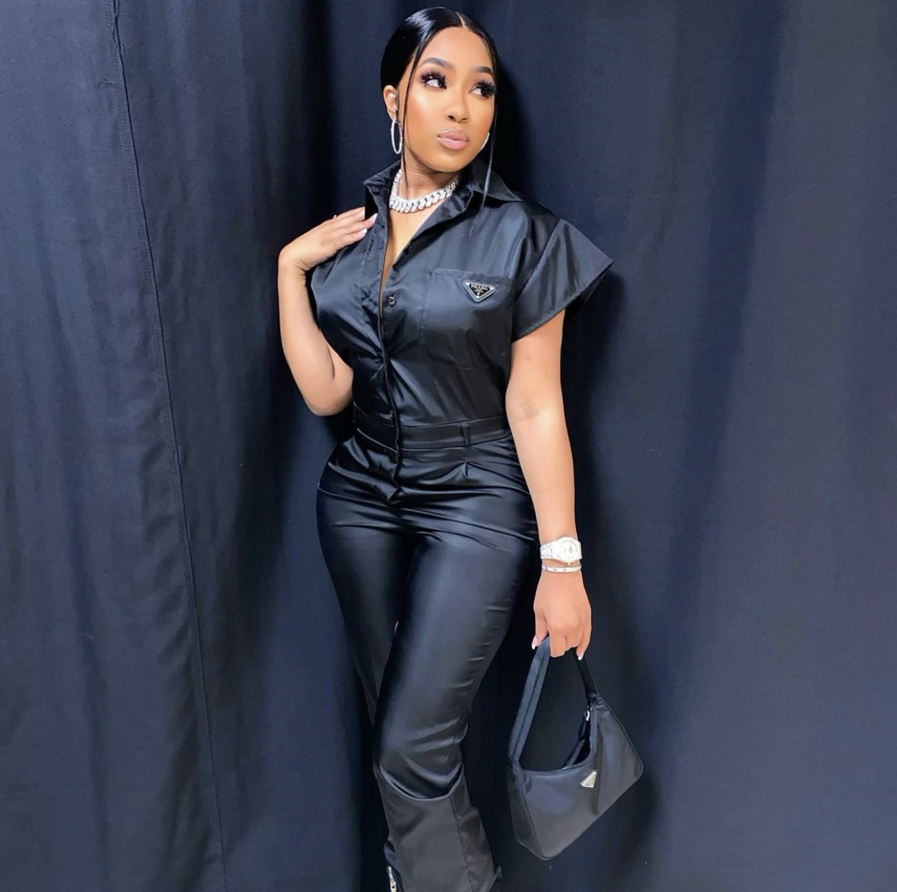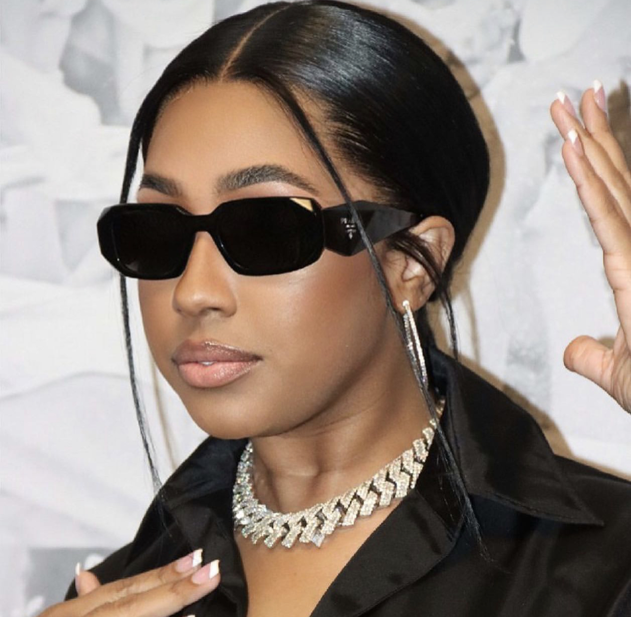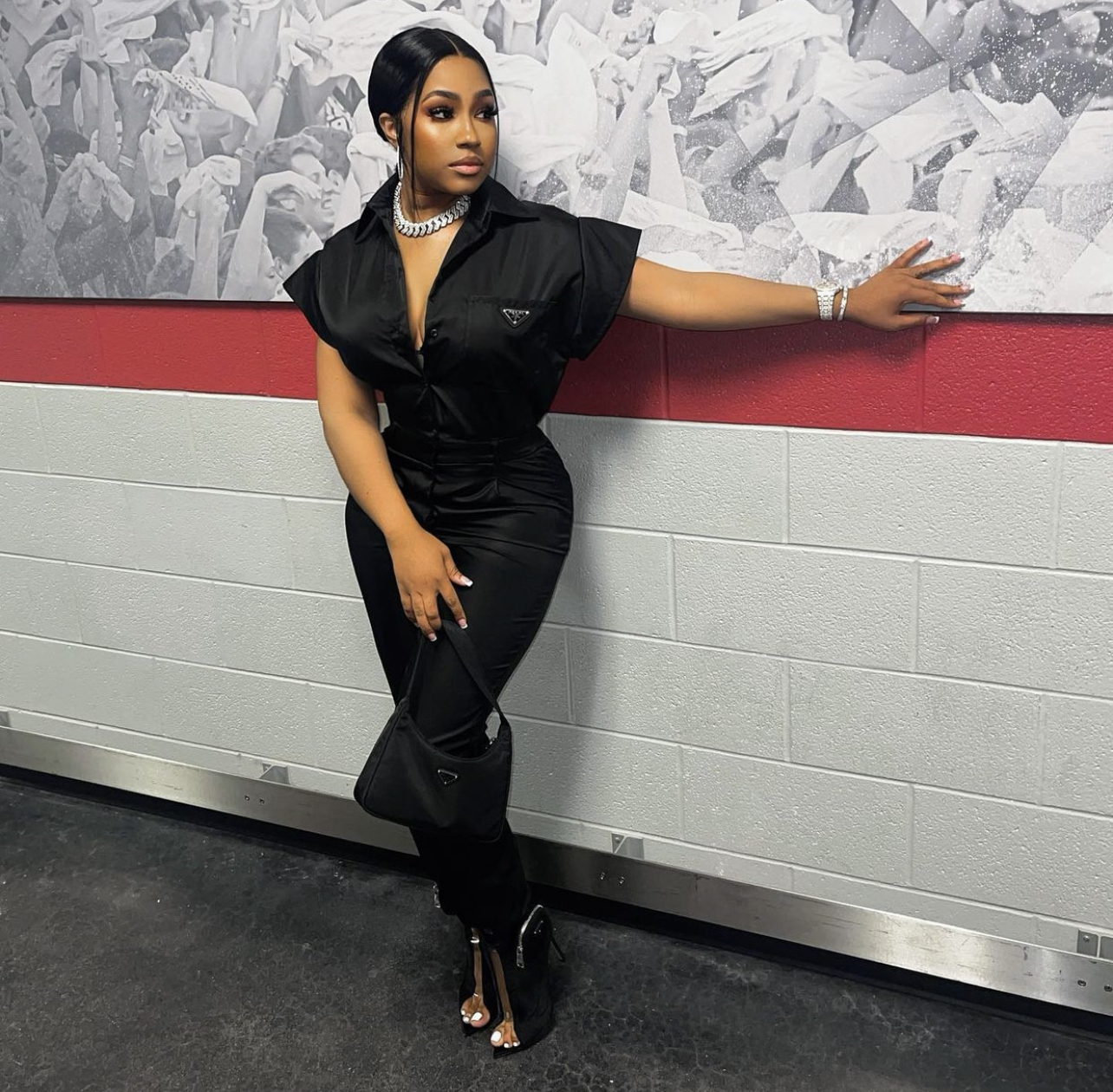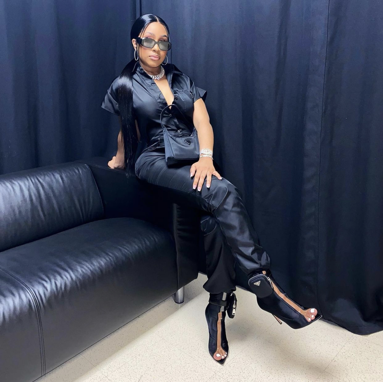 Yung Miami wore a full black Prada look including a $2,340 Re-Nylon short-sleeved jumpsuit, $410 Symbole sunglasses, and $895 Re-Nylon Re-Edition 2000 mini-bag. She also wore a pair of $1,295 Gianvito Rossi transparent panel boots which she accessorized with a Prada $460 Nappa leather mini-pouch with elasticized band around the ankle of the boots.