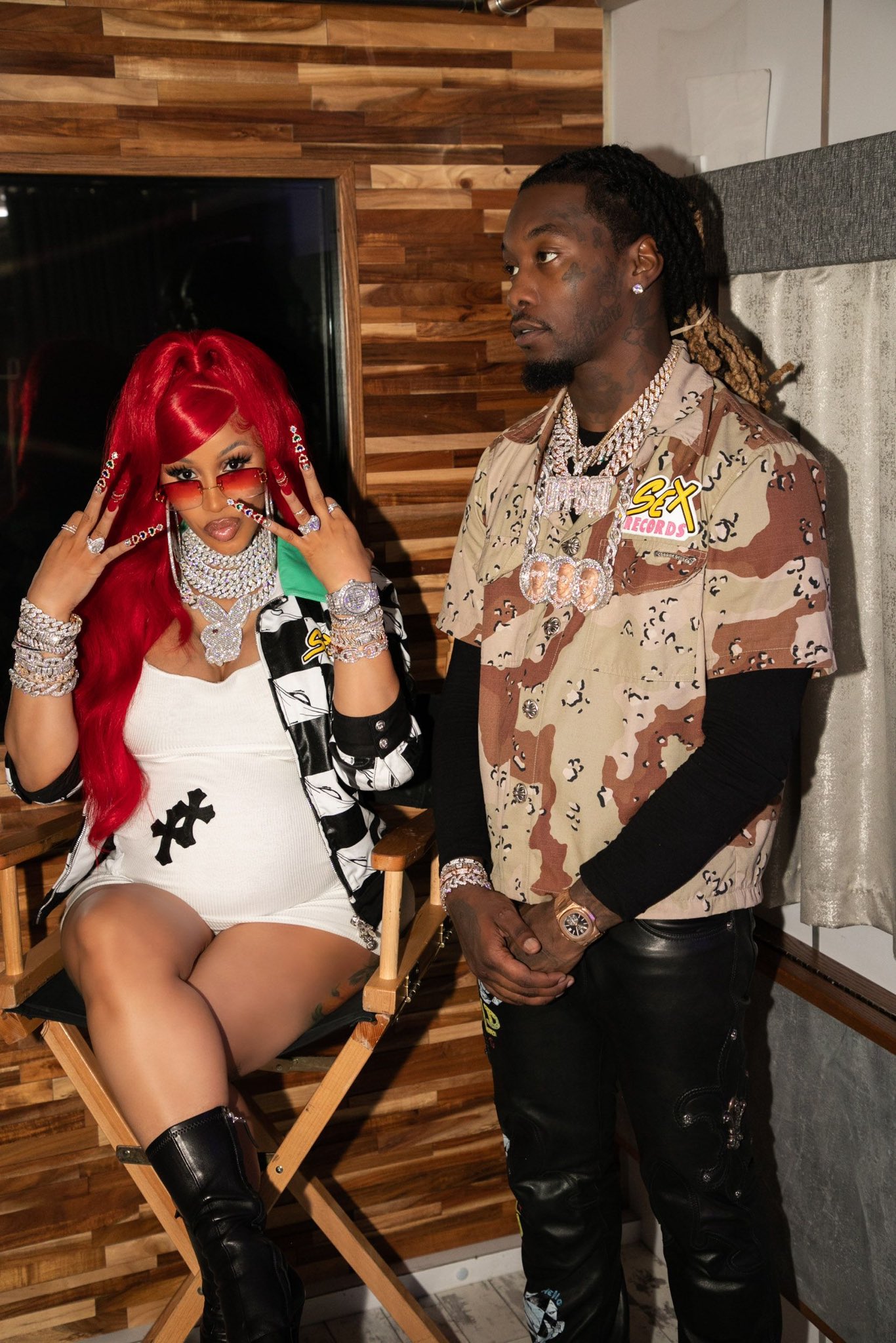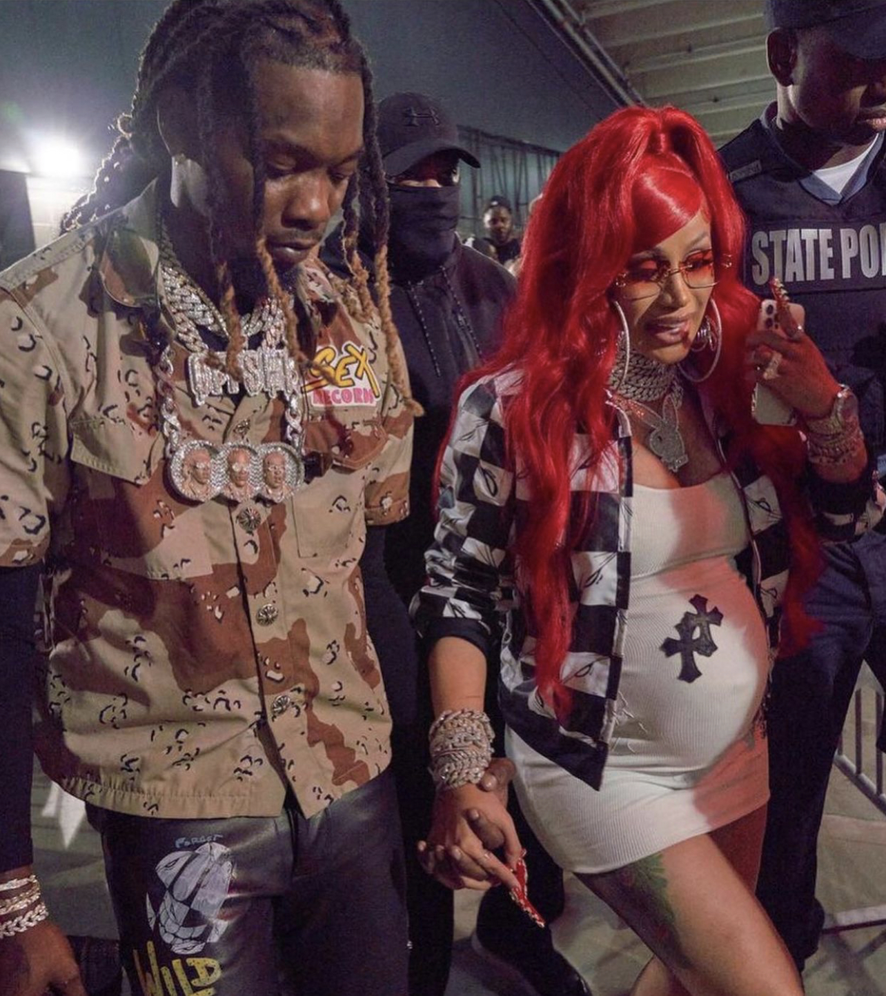 Cardi B opted for fiery red hair which she wore up in ponytail. She matched her red hair with a pair of red sunglasses.