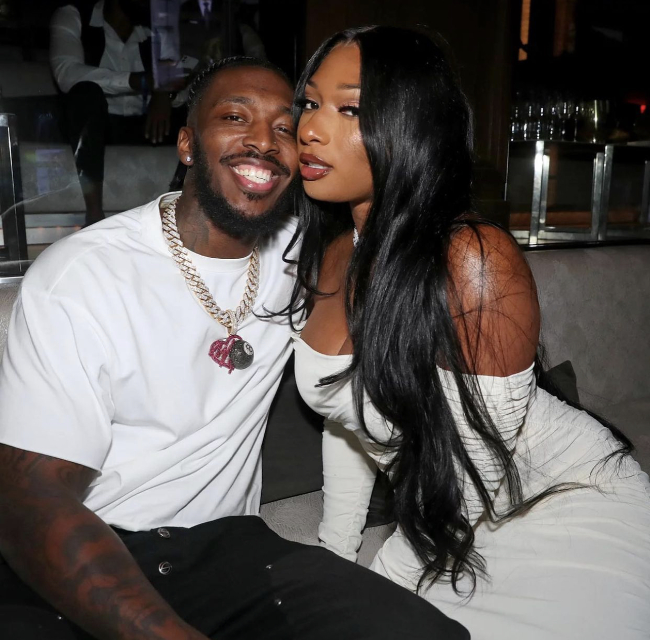 Megan Thee Stallion attended Jay-Z’s 40/40 Club anniversary party with her boyfriend Pardison Fontaine. Styled by Zerina Akers, she wore a white off-the-shoulder $2,800 Khaite “Lydia” dress paired with a white Chanel handbag and crystal fringe wraparound heeled sandals.