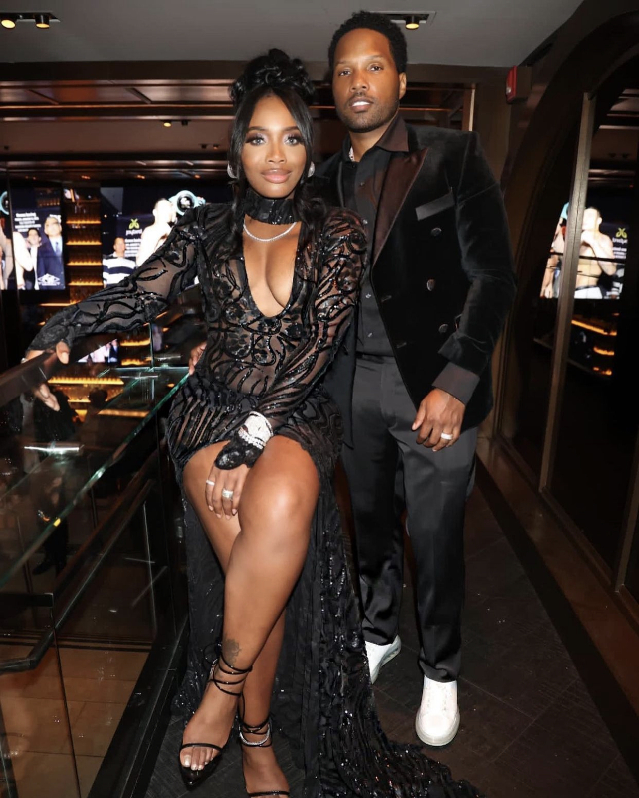 Yandy Smith-Harris posed with husband Mendecees Harris wearing a Versailles Boutique gown. Mendeecees wore a Helen Anthony blazer, Miranda Kurdish pants, and Alexander McQueen shoes. Both were styled by Vladimyr Pierre-Louis.