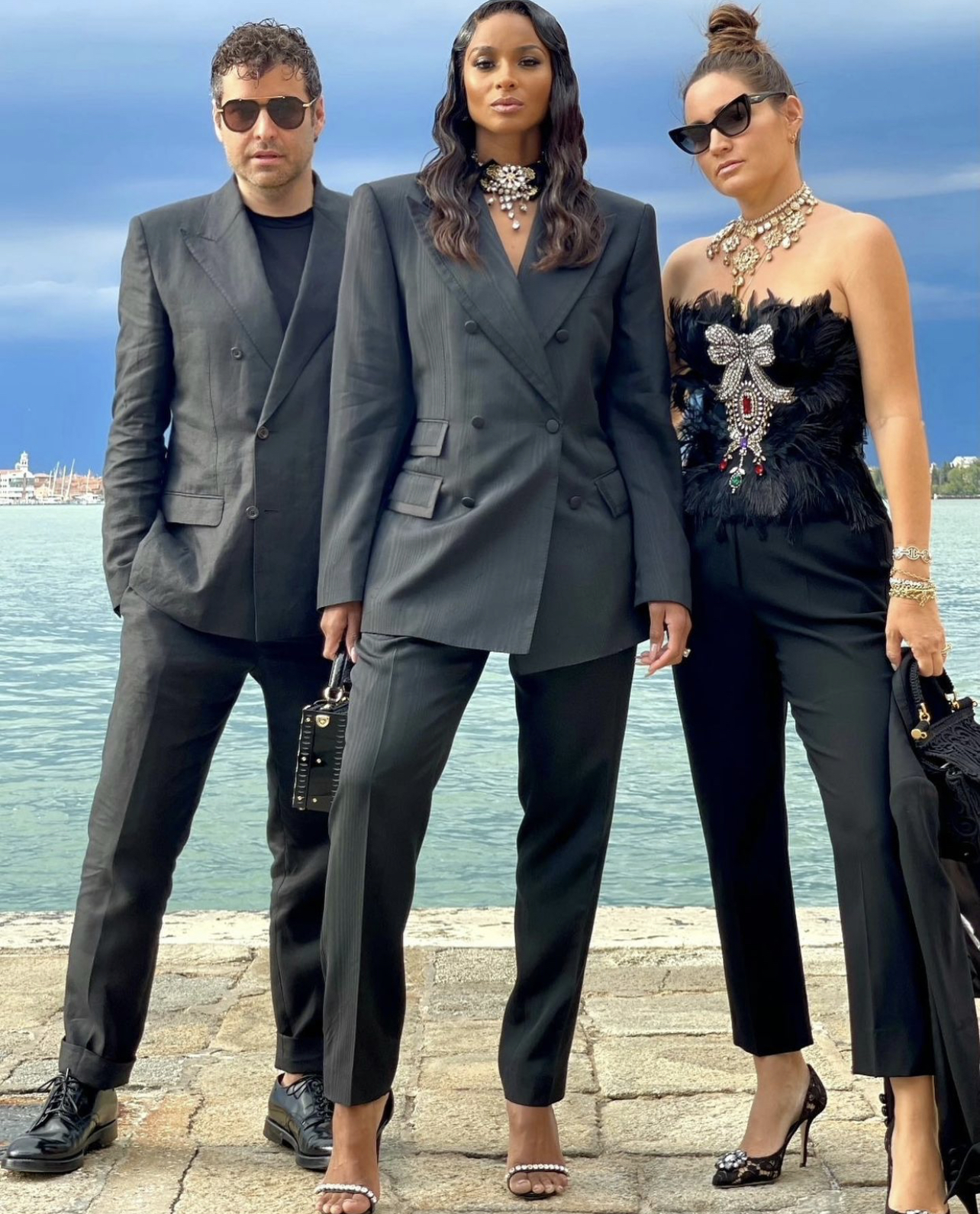 Ciara rocked a menswear-style black double breasted blazer and trousers, styled by Rob Zangardi and Mariel Haenn. For accessories, she went with a jewel adorned choker necklace and a pair of what appears to be embellished patent leather loafers. The singer later switched to a pair of pearl-studded heeled sandals as she posed alongside her glam squad including her stylists, makeup artist Yolanda Frederick, and hairstylist César DeLeön Ramîrez.