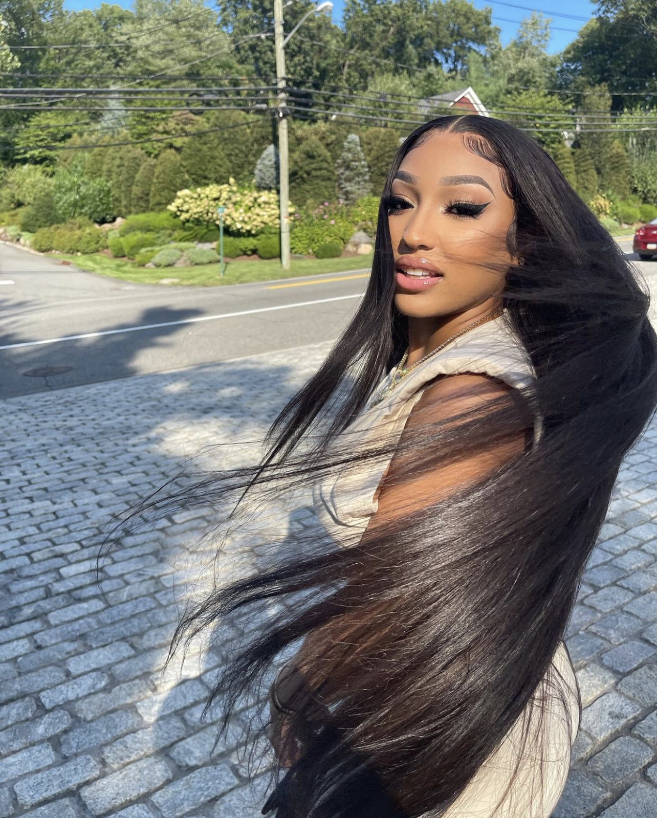 Ella Rodriguez, aka Ella Bands or Slay By Ella, recently popped out in a trendy cream look. While whipping her long straight tresses, she can be seen rocking a cream midi dress from Fashion Nova.