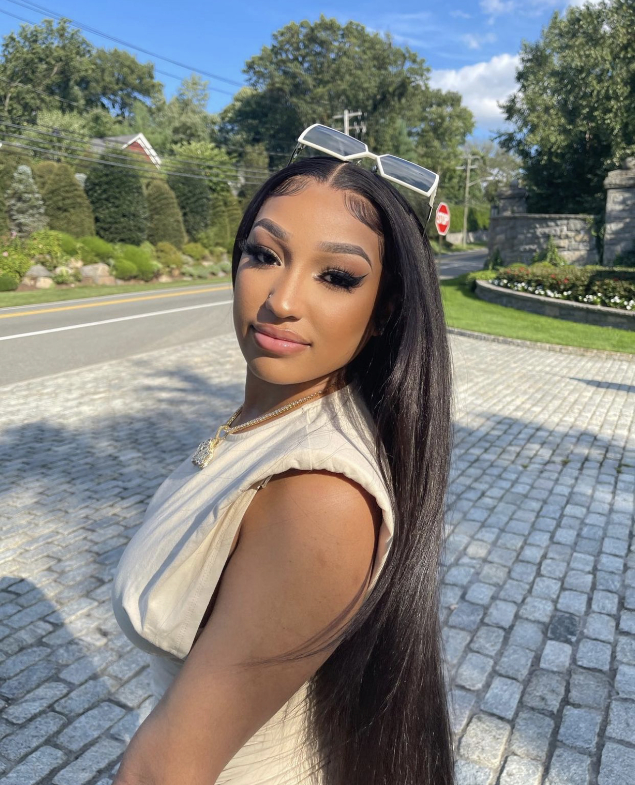 Ella Rodriguez wore the $44.99 One And Only Shoulder Pad Midi Dress from the popular fashion retailer. She decided to compliment the cream vibes of her dress with her accessories. The young entrepreneur accessorized her look with oversized sunglasses and Chanel pieces including a quilted chain handbag and slide sandals. She also went with icy jewelry pieces such as bracelets, necklace, and stud earrings.