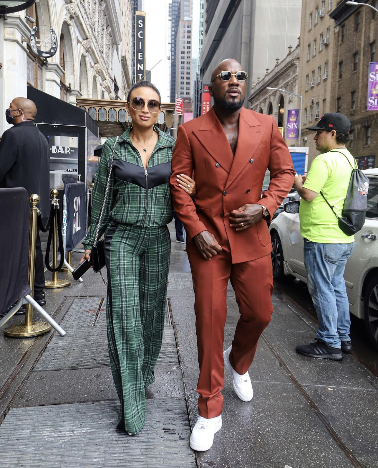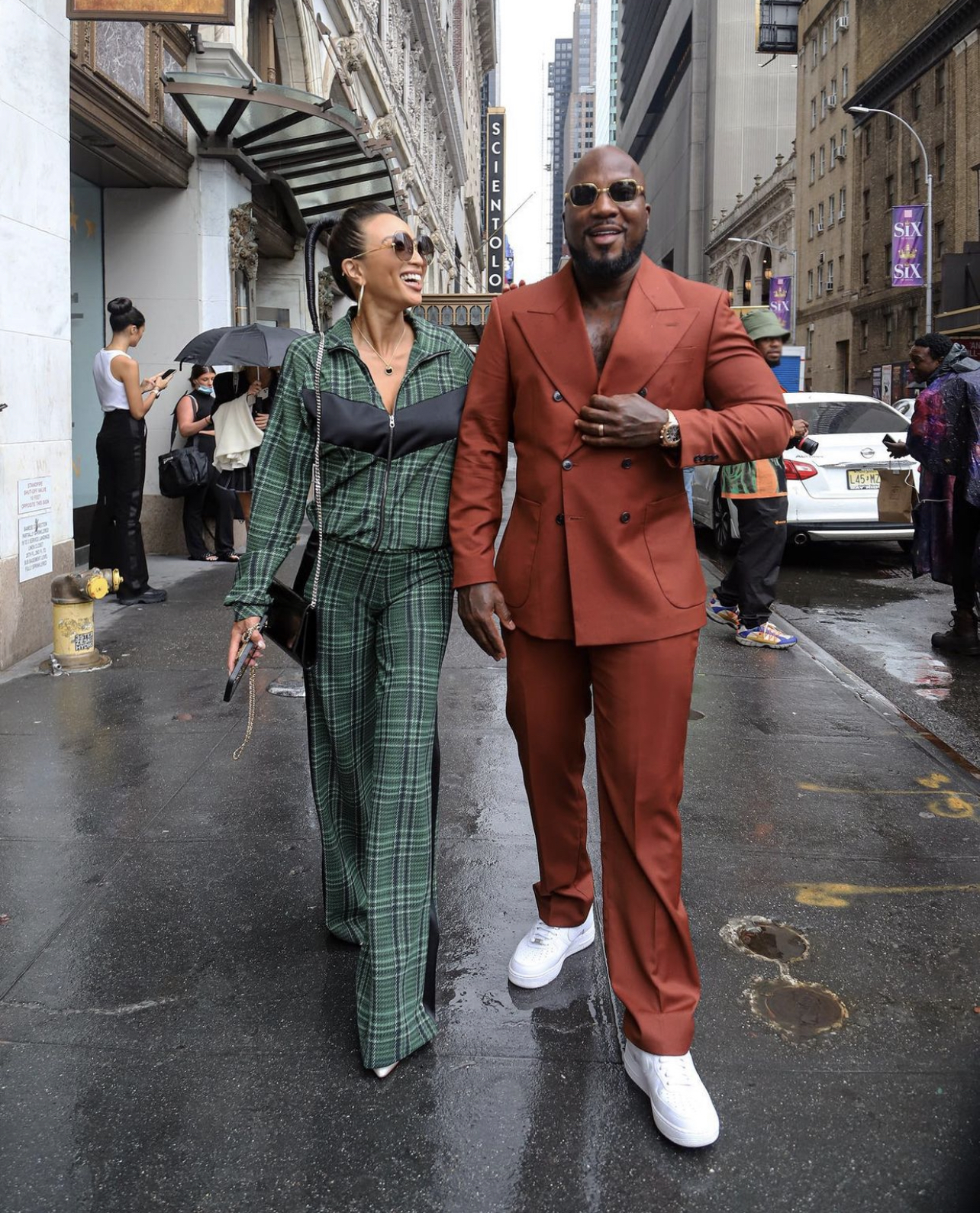 Of course! Jeannie Mai stepped out for NYFW festivities with her husband Jeezy wearing a Chiara Boni La Petite robe look. Her look featured a zip-up jacket and wide leg trousers in a green plaid print complete with a contrasting black stripes. Unfortunately, Mai’s look is currently unavailable.