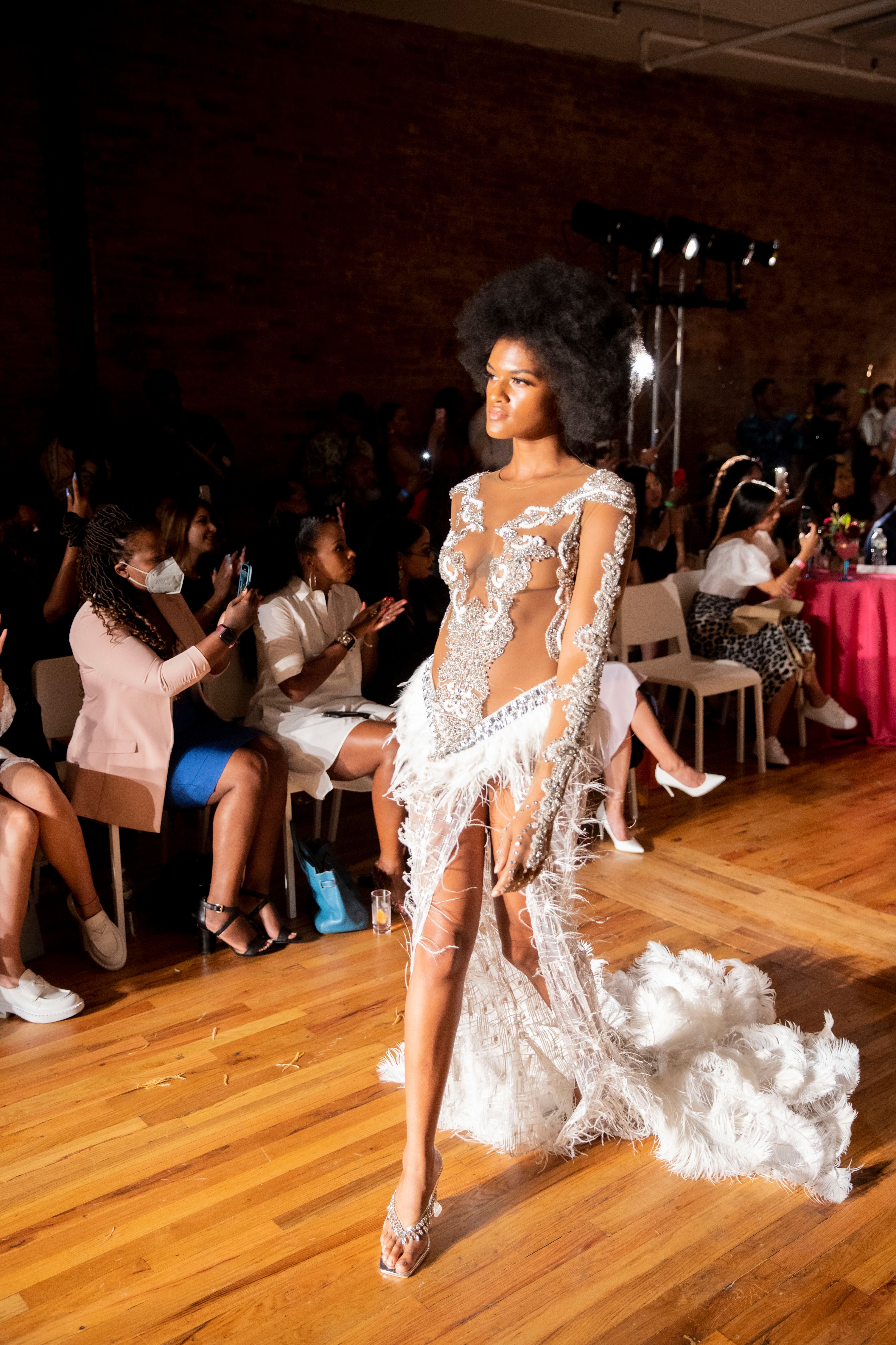 White chairs lined both sides of the runway filled with guests and celebrities who mixed and mingled together to network and grab quick flicks with one another. Gracing the front row of the Bomb Fashion Show, we spied singer Sevyn Streeter, fashion maven Ty Hunter, model and Real Housewives of Atlanta star Cynthia Bailey, actor and singer Rome Flynn, designer Kal Williams, Real Housewives of Potomac star Ashley Boalch Darby and husband Michael Dabry, and Geraldine Ross. Other familiar faces in building included models Mariama Diallo and Broderick Hunter, media personality Jayda Cheaves, rapper DreamDoll, and stylist Kris Shelby.