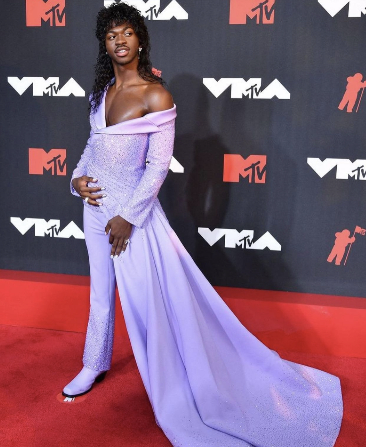 Lil Nas X continues to turn heads and shake up the industry with his music, visuals, and even looks! Instantly thinking of Prince, the artist stepped on the red carpet wearing a custom purple ensemble by Versace, styled by Hood Musa. His look appears as a suit including an off-the-shoulder jacket with a dramatic train and trousers, both of which are embellished with crystal embroidery.