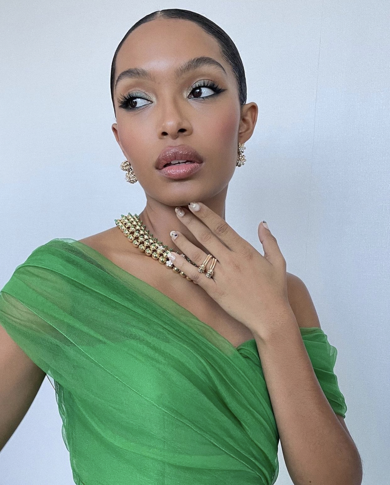 Yara Shahidi was classic in custom Dior, styled by Jason Bolden. The young actress and activist graced the red carpet in a timeless green gown which clearly takes cues from a 1950s party dress. The gown featured a flared skirt and off-the-shoulder component which found itself draped with a sheer material. She accessorized the dazzling green dress with Cartier jewelry and brown Louboutin pumps.