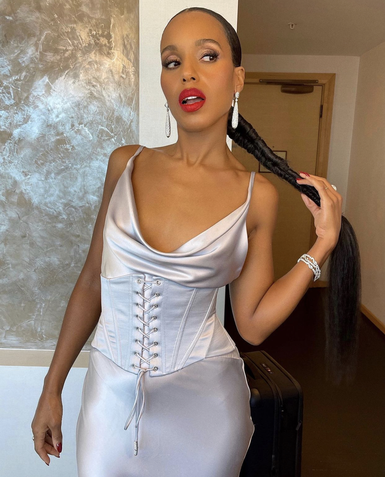 Kerry Washington served a major style moment wearing a custom Etro gown, styled by Law Roach. Giving us simple yet significant glam, the silver dress drapes elegantly on Washington in slinky smooth silk complete with a classic cowl neck and lace-up corset that hugs the waist. She completed the look with Stuart Weitzman heels and De Beers “Talisman” cocktail earrings. Going with the night’s personal favorite makeup touch, she went with a red lip for a bold pop of color.