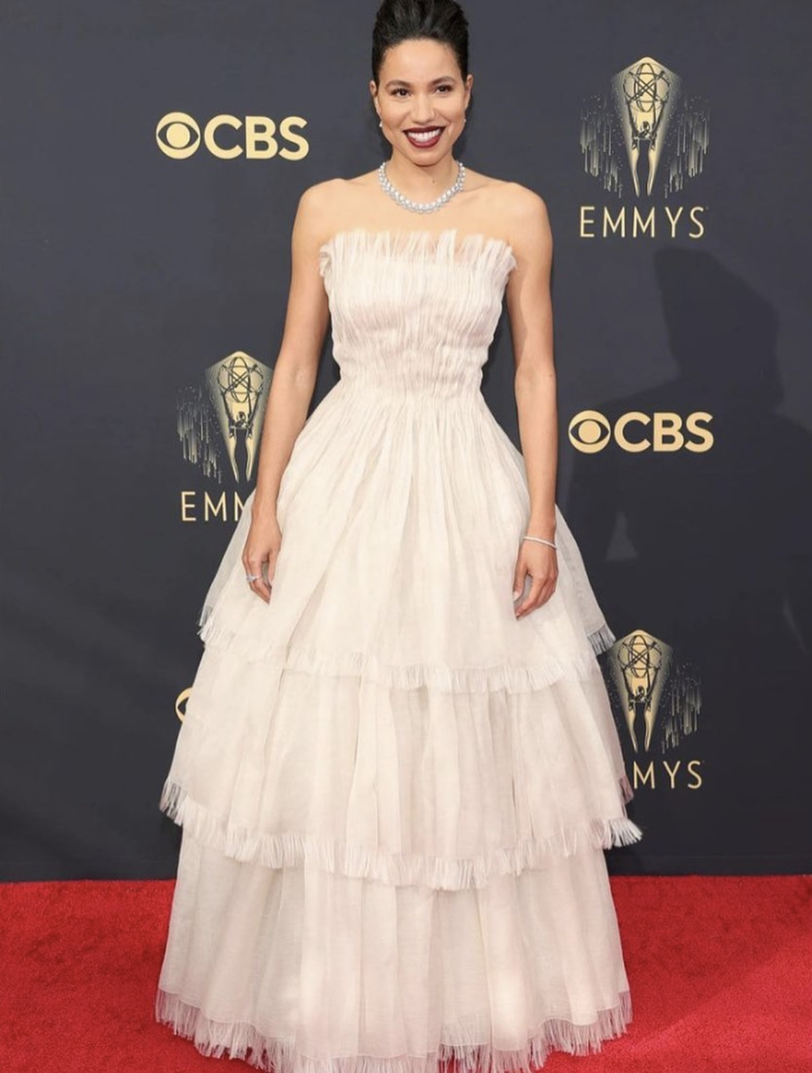 Jurnee Smollett provided an incredibly dreamy look at the 2021 Emmys wearing Dior Couture, styled by Alexandra Mandelkorn. The Lovecraft Country star’s strapless couture gown was truly straight of a fairy tale with its delicate tiered slightly-poofy skirt with modernly frayed hems. She accessorized the look with Bulgari pieces and Louboutin platform heels. Smollett also went with a classic pulled-back bumped hairstyle and a Fall-ready burgundy lip.