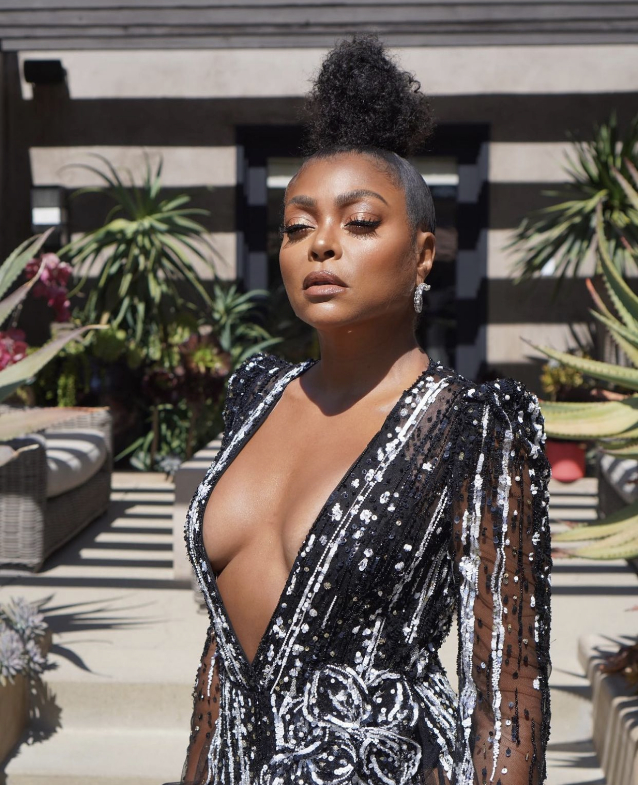 Taraji P. Henson shows us that she will always be “it” in a Elie Saab gown, styled by Jason Bolden. From the brand’s Resort 2022 collection, her show-stopping dress appears in black sheer material entirely embellished in black and white sequins with a sexy plunging neckline. She allowed the dress to steal the show opting solely for a pair of Roberto Coin earring. She then concludes the look with a bun hairstyle along with a natural makeup look.