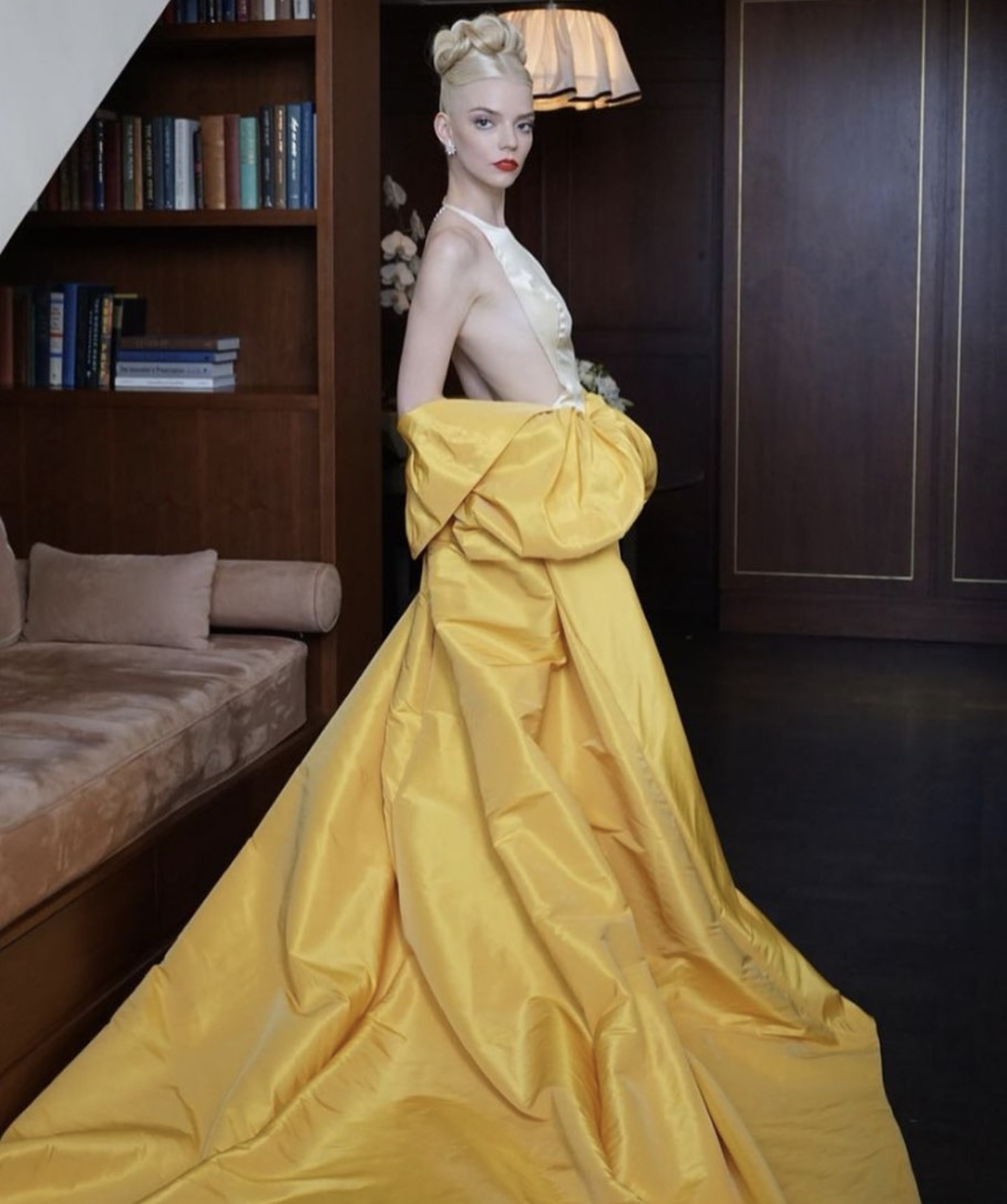 Anya Taylor-Joy stunned in a custom Dior Couture look, inspired by an Edith Head-designed gown for Shirley MacLaine in What a Way to Go! (1964). Styled by Law Roach, her custom Dior ensemble included a backless dress draped with a crystal chain detail along with a long, dramatic yellow train which puddled gracefully on the floor. She opted for a pin-curled updo along with a confident red lip to finish her look.