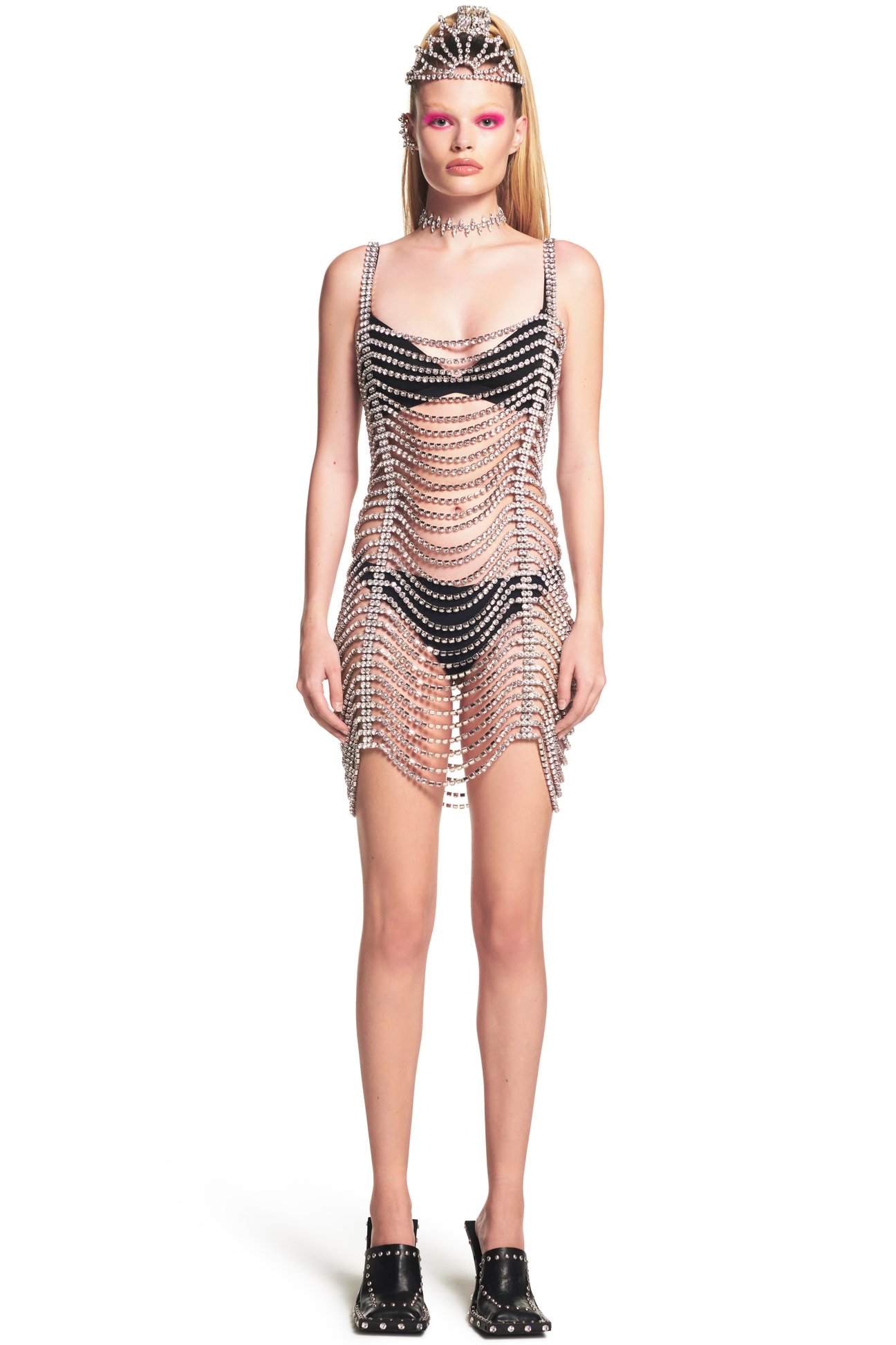 The Area dress is absolutely dreamy with its glistening crystal drapery. It’s clearly not your typical cocktail dress, it’s much better. The sleeveless mini dress is completely see-through, leaving no room for imagination but all eyes on you.