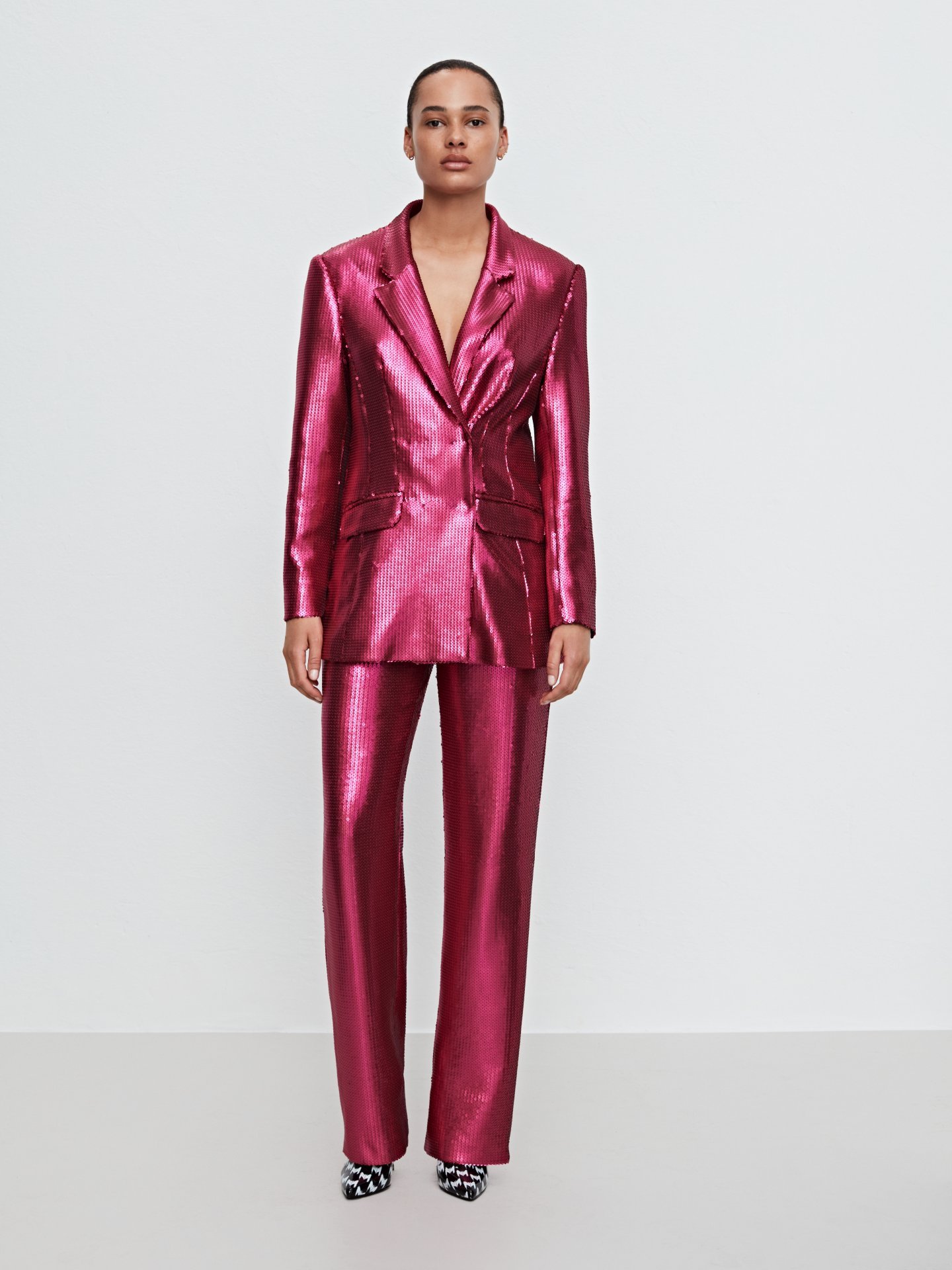 While appearing at the brand’s fashion show, Yung Miami wore a Marcell Von Berlin Fall 2021 outfit, styled by Bryon Javar. Her dazzling look included the $1,100 bubblegum pink sequin blazer and $710 loose-fit sequin pants. She also wore the brand’s $1,120 MM buckle bag as her accessory for the evening. She then rounded the look off with a pair of Louboutin heeled sandals as her footwear selection.