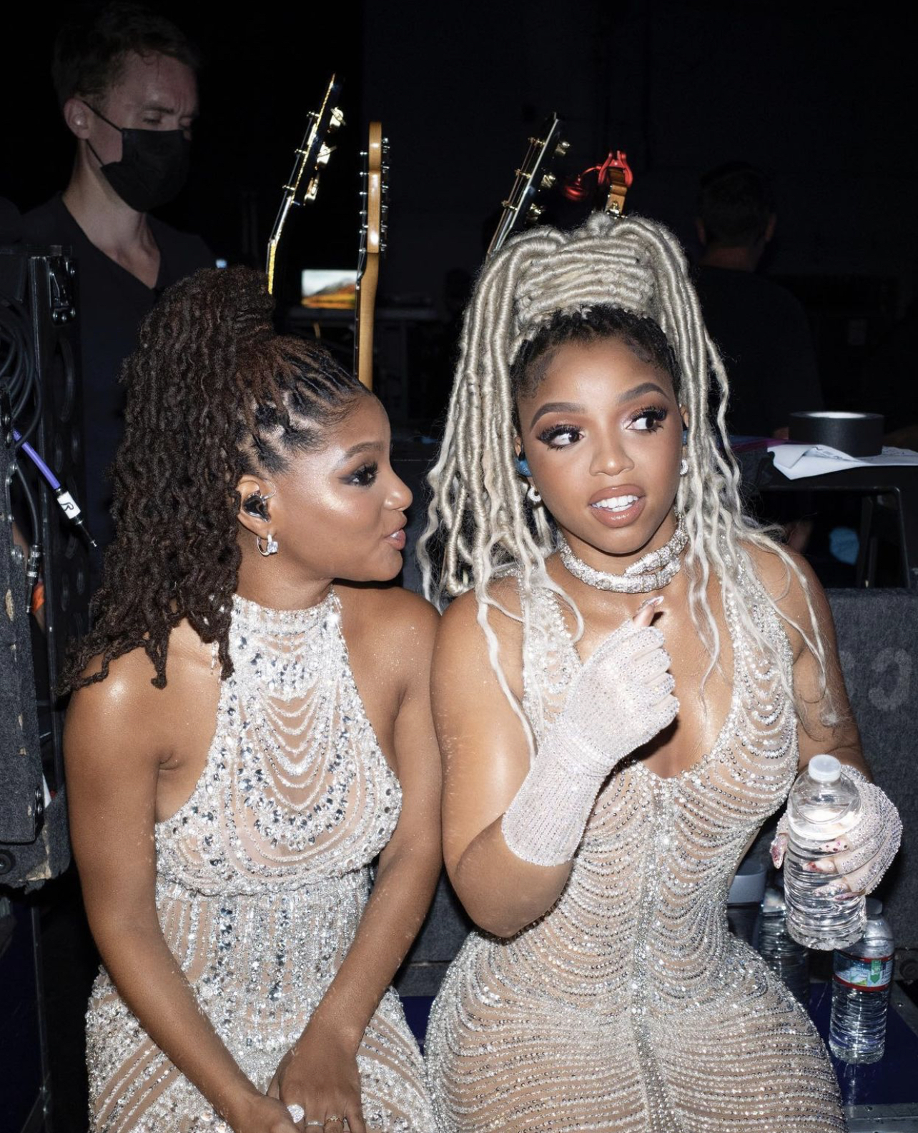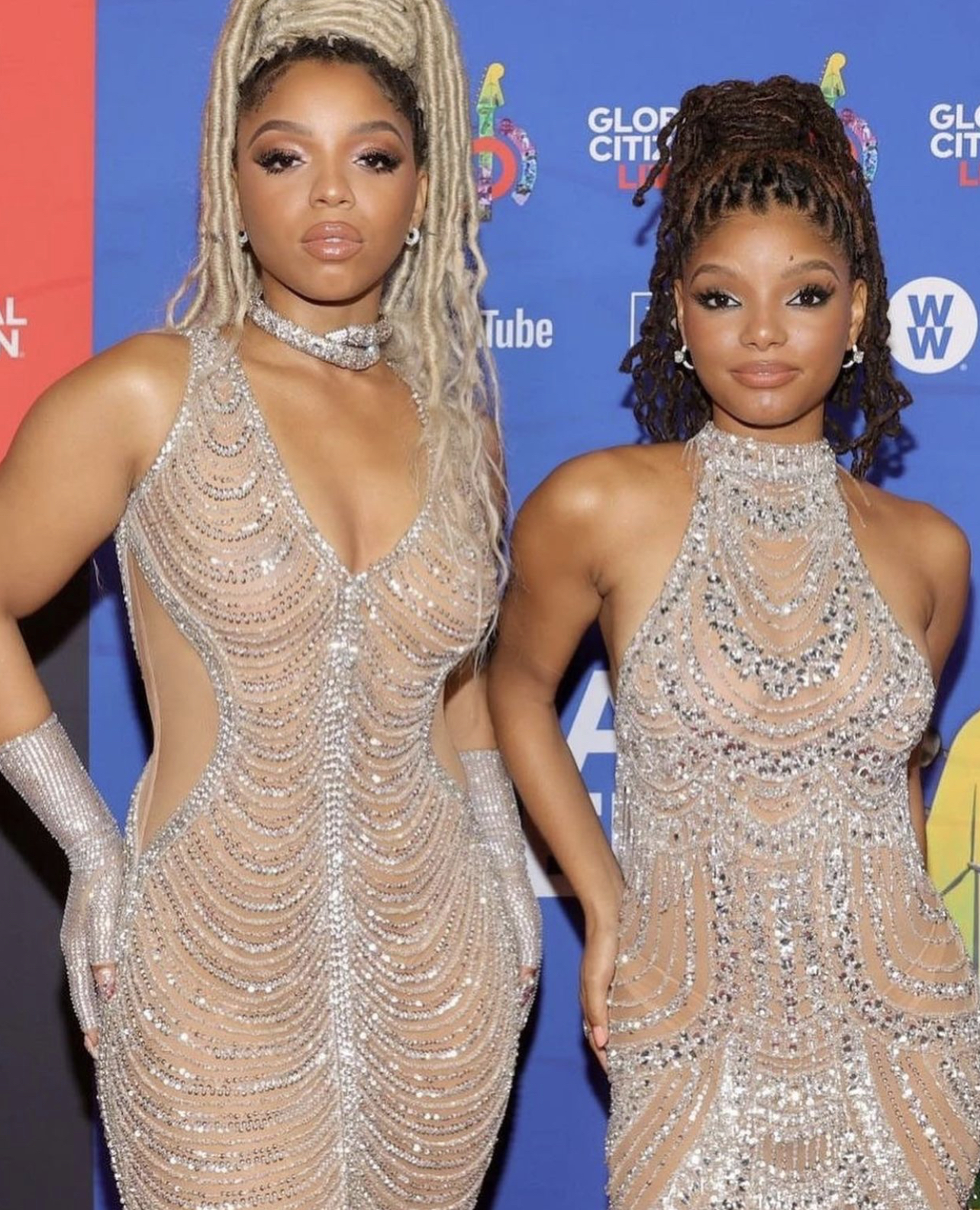 Chloe and Halle Bailey performed in Yousef Al Jasmi gowns from the Couture 2021 collection. Both gowns consisted of a slightly see-through nude material adorned entirely with crystal embellishments.