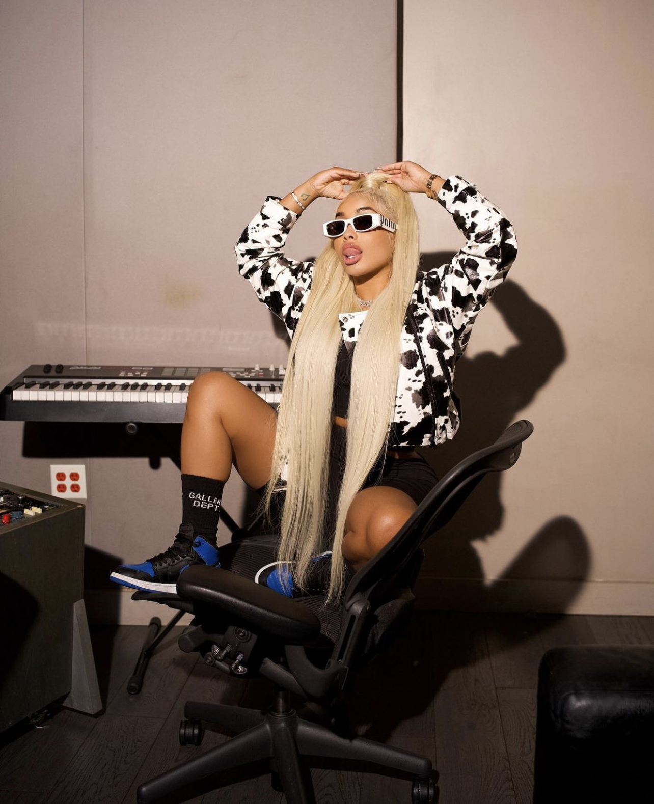 DreamDoll was spied working in the style during a studio session recently. She rocked a casual look which included a cow print leather moto jacket by Fashion Nova.
