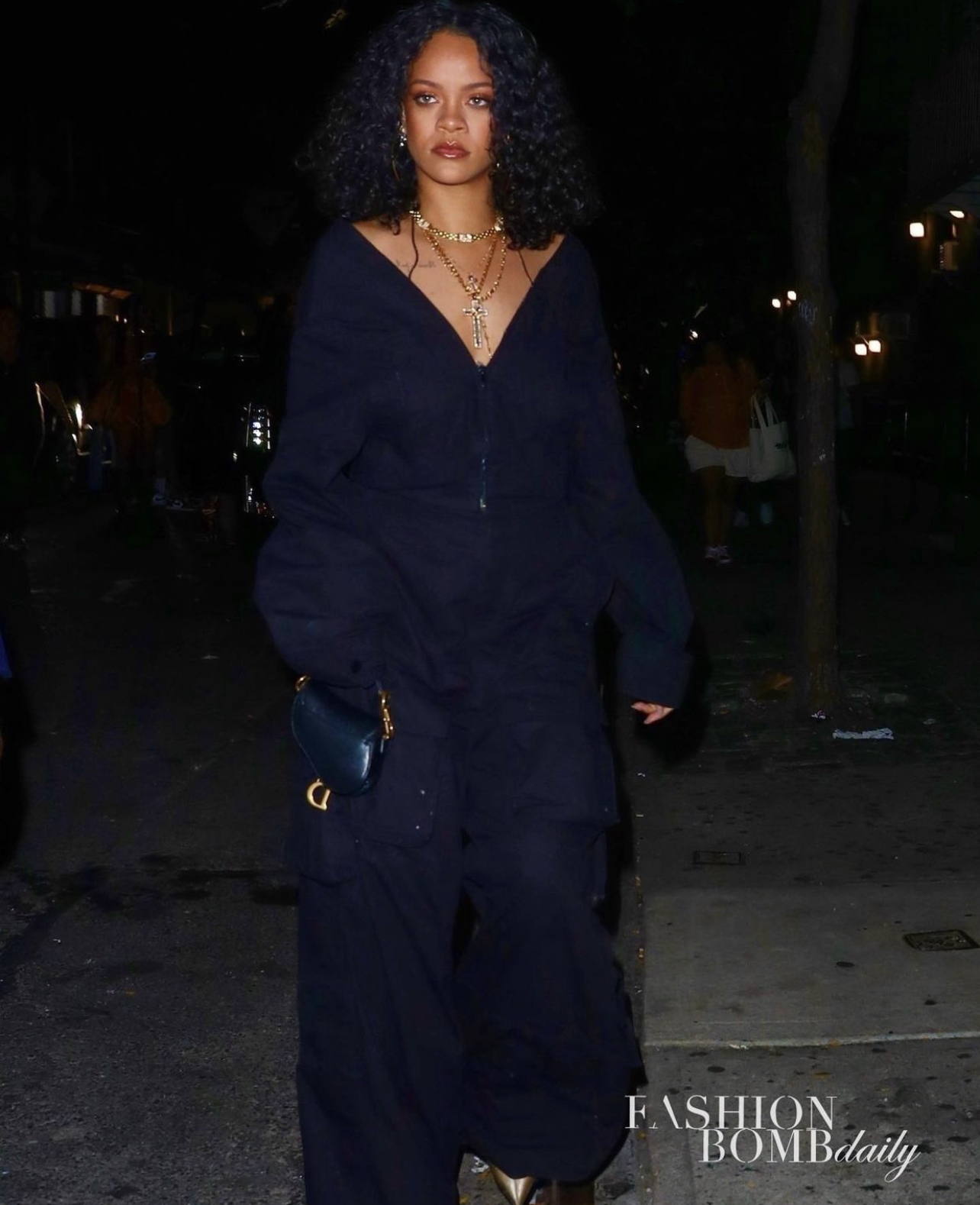 Rihanna Attends Afterparty in NYC Wearing Matthew Adams Dolan Navy Off-the-Shoulder Jumpsuit, Dior Mini Saddle Bag, and Fenty Boots