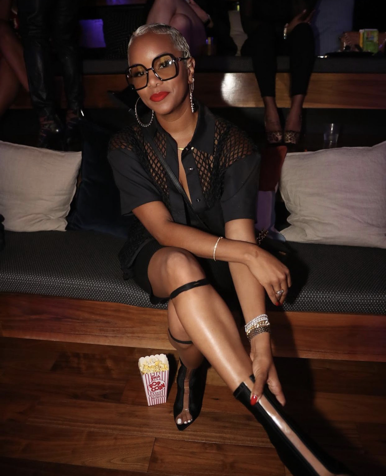 LeToya Luckett attended a finale party for the conclusion of Power Book III: Raising Kanan‘s first season. For the event, she wore a black fishnet short sleeve shirt from Shop J. Bolin paired with black $280 Jacquemus La Montagne ‘Le Short Sierra’ shorts and $1,295 Gianvito Rossi “Hiroko” booties. For accessories, she wore a pair of $420 Gucci square-frame sunglasses and a black handbag with an oversized chain detail. She then finished the look with jewelry pieces such as bracelets, rings, a watch, and hoop earrings.