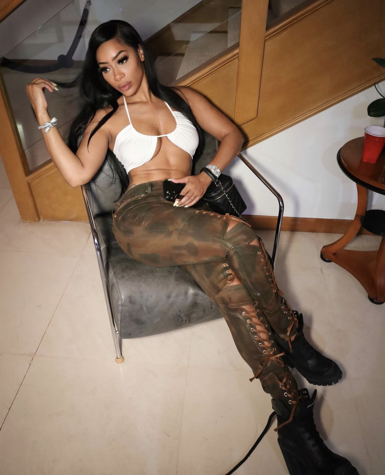 Tommie Lee wore the white cropped ruched halter top from the $49.99 Try Your Luck Ruched Skirt Set. She paired the top with camouflage lace-up trousers and heeled combat boots. Finishing off the look, she went with a Chanel black quilted bag and icy jewelry pieces for her accessories.