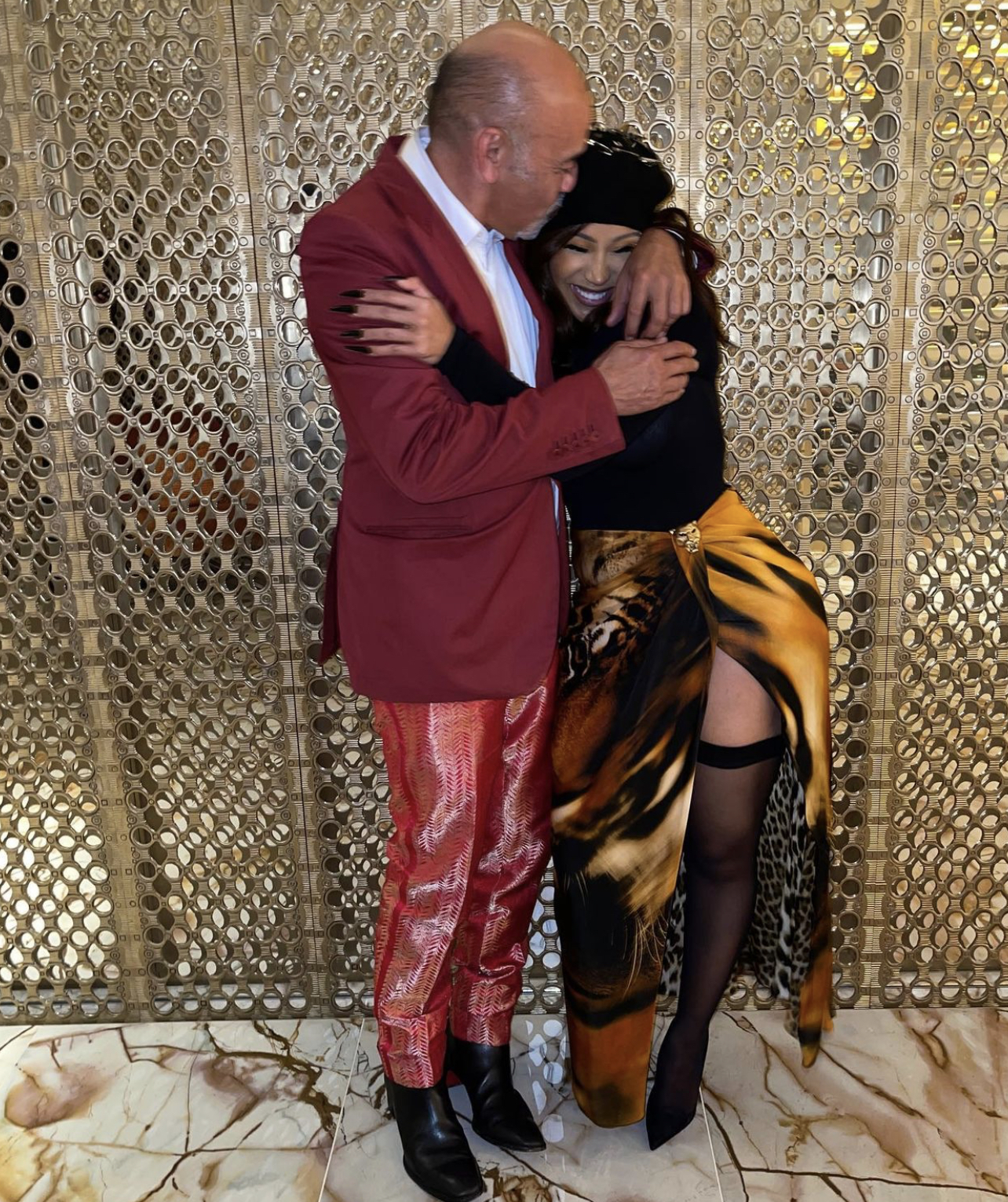 Cardi B met the great Christian Louboutin wearing a $250 Wolford “Colorado” black high neck long sleeve bodysuit paired with a Roberto Cavalli Spring 2022 gold tiger head clip custom skirt. She accessorized her look with a $250 Gladys Tamez Millinery beret with chains, $53 Wolford Individual 10 Stay-Up thigh-high tights, and $745 Louboutin So Kate black suede pumps.