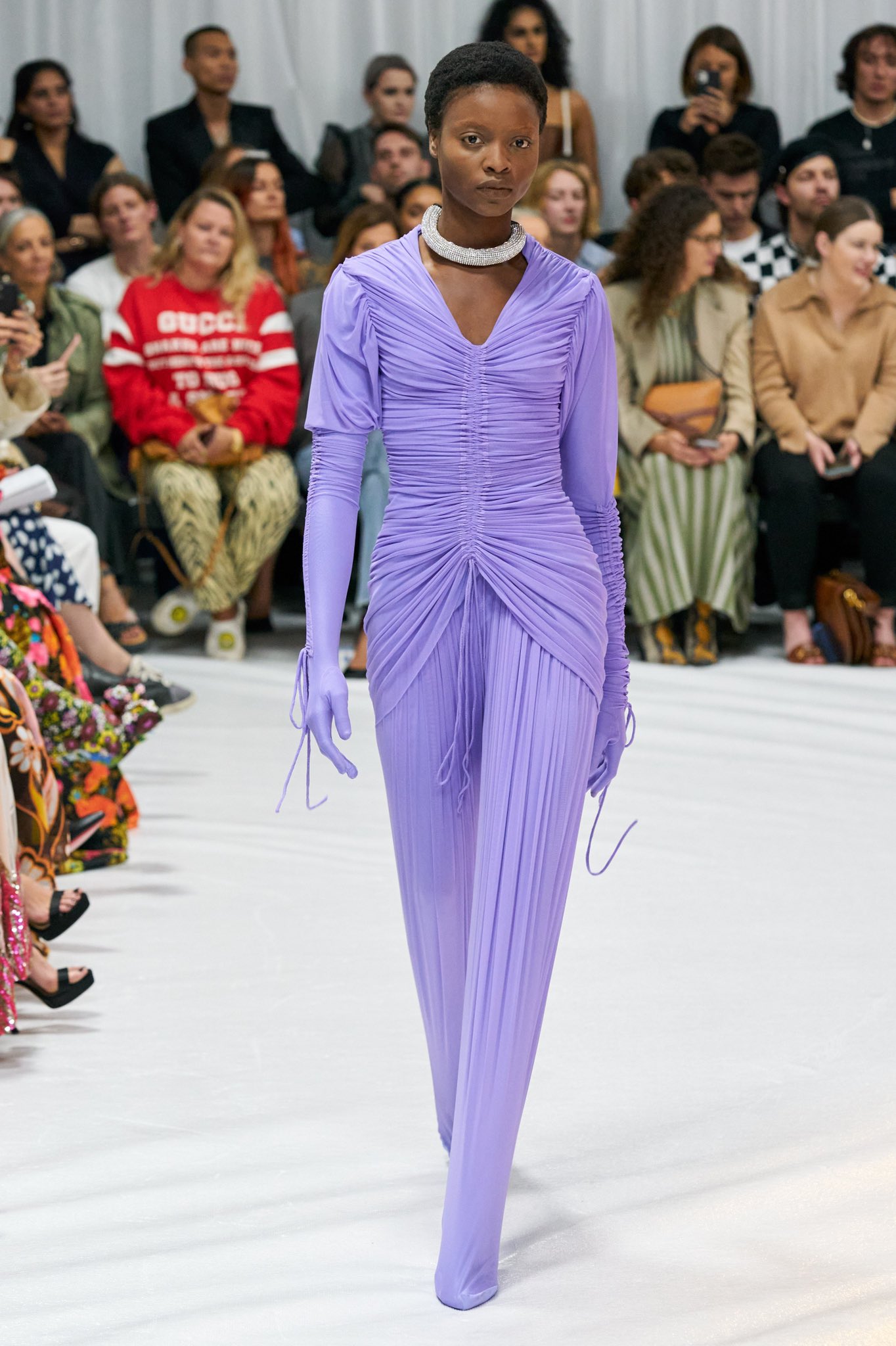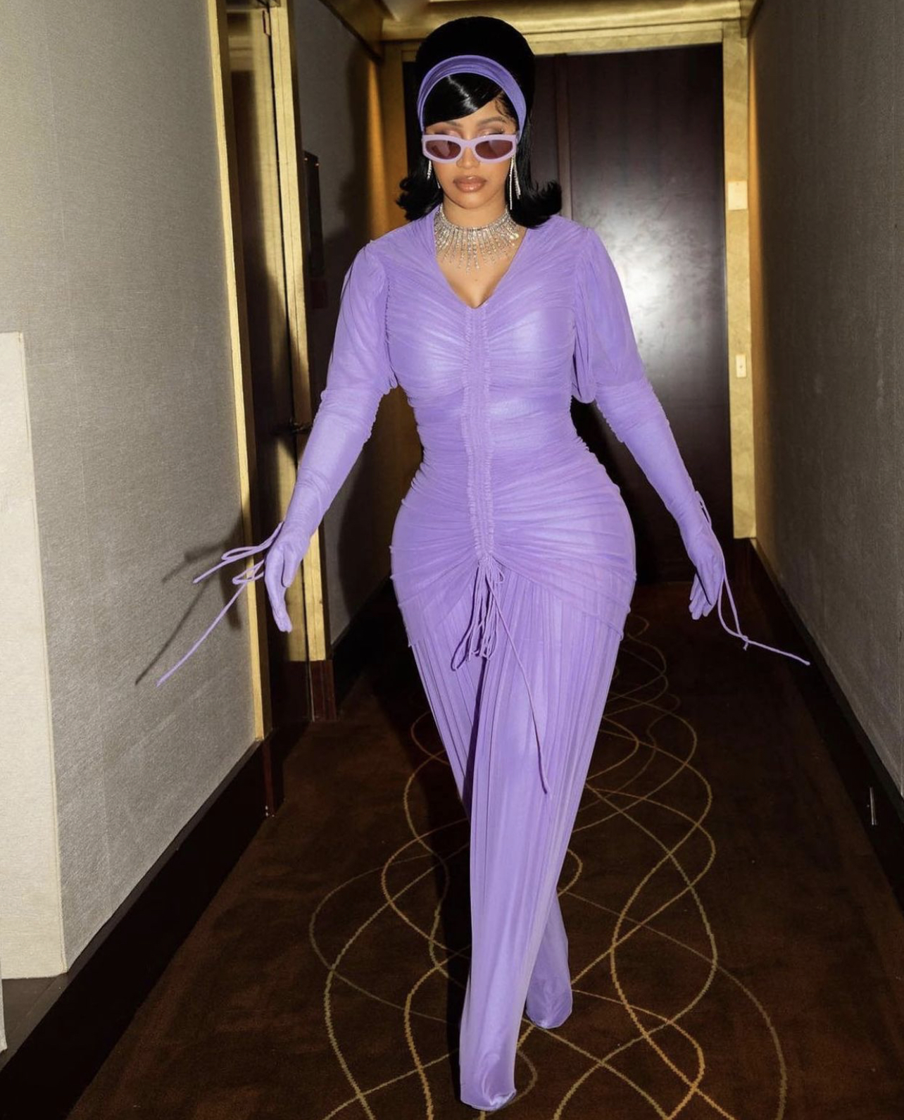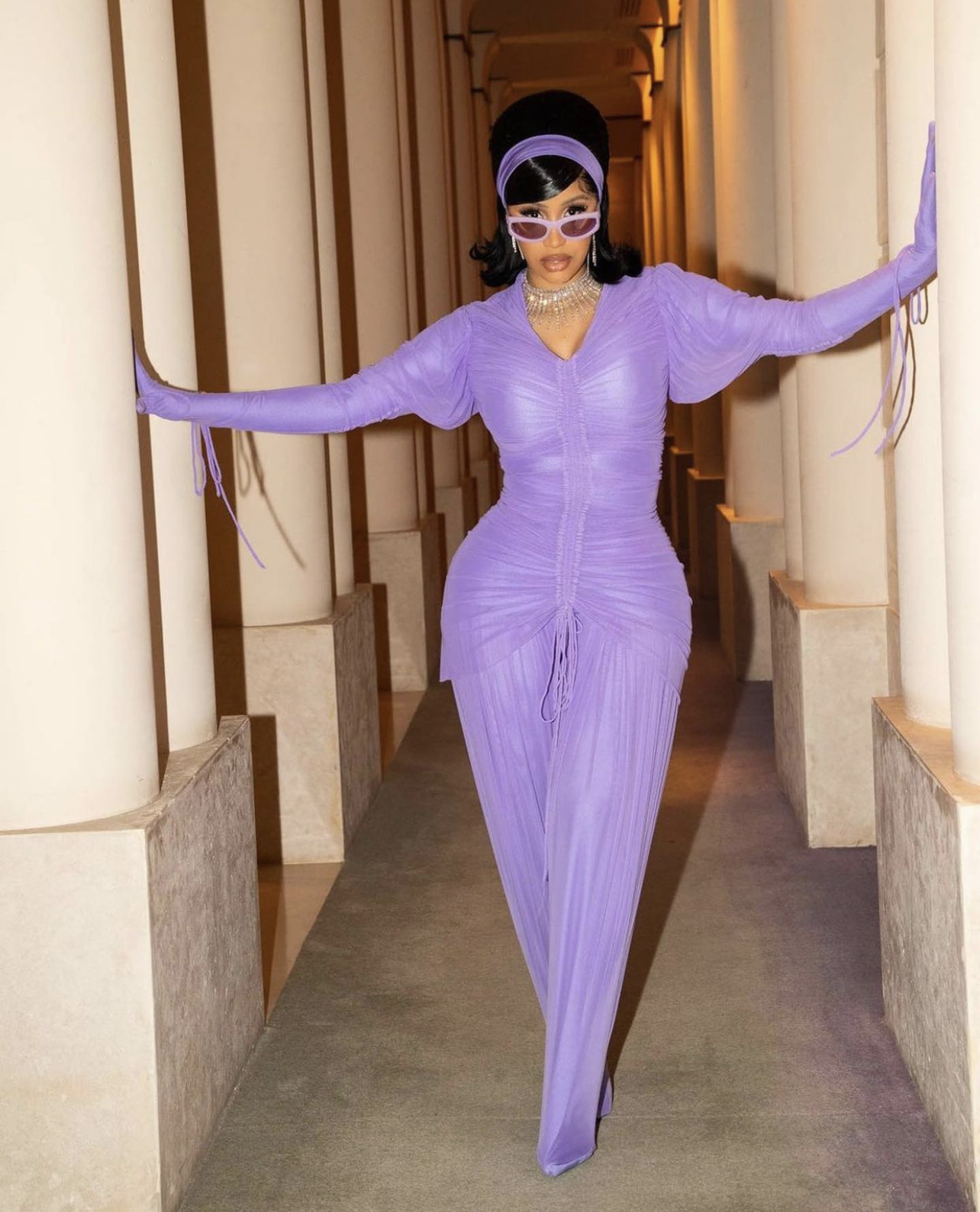 Cardi B attended the Messika fashion show wearing another monochromatic look by Richard Quinn. This time, the rapper opted for the purple pleated look from the Spring 2022 collection. Joining her look’s lavender aesthetic, she wore a purple headband, $510 Bottega Veneta oval sunglasses in lilac and Messika High Jewelry Sea King necklace.