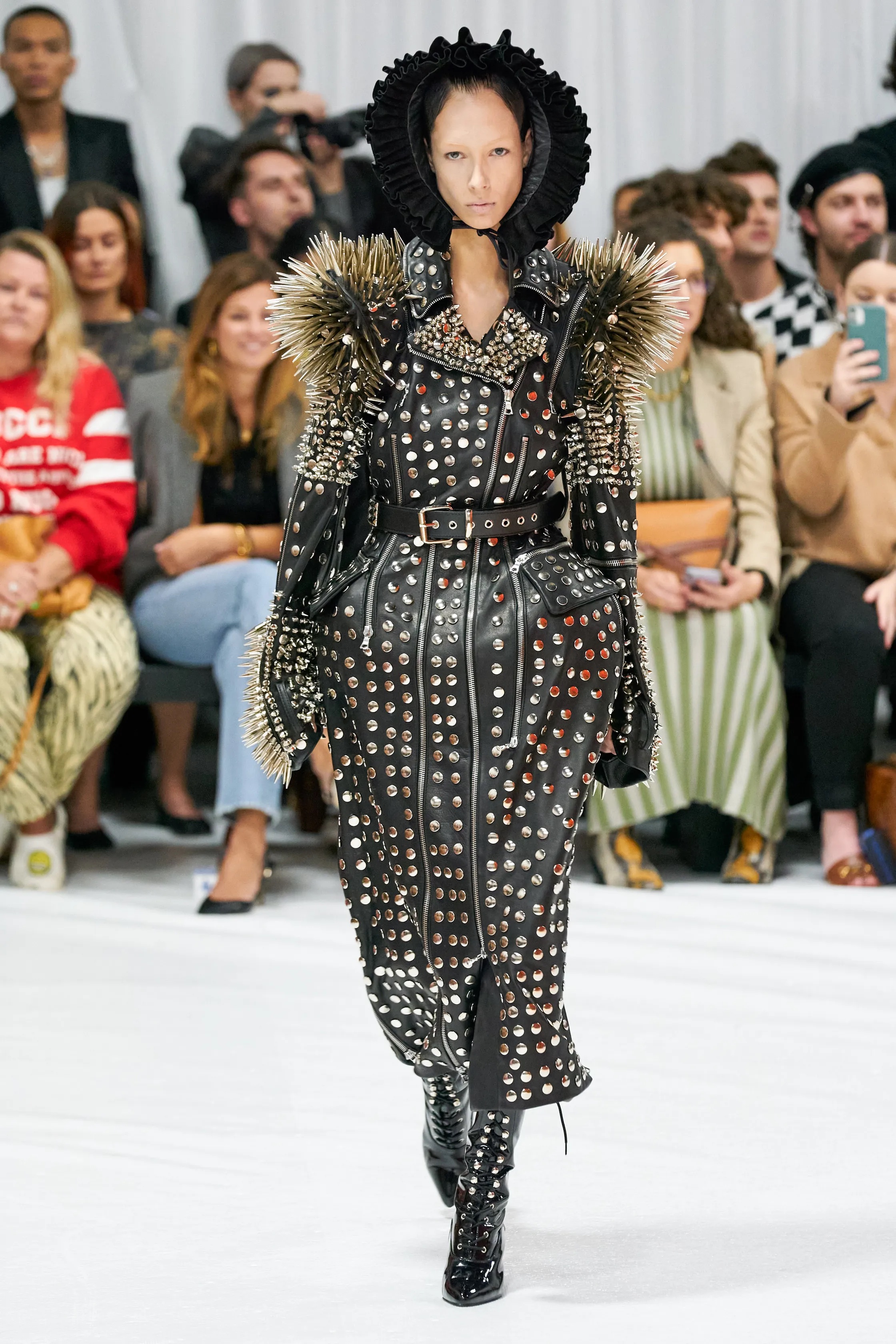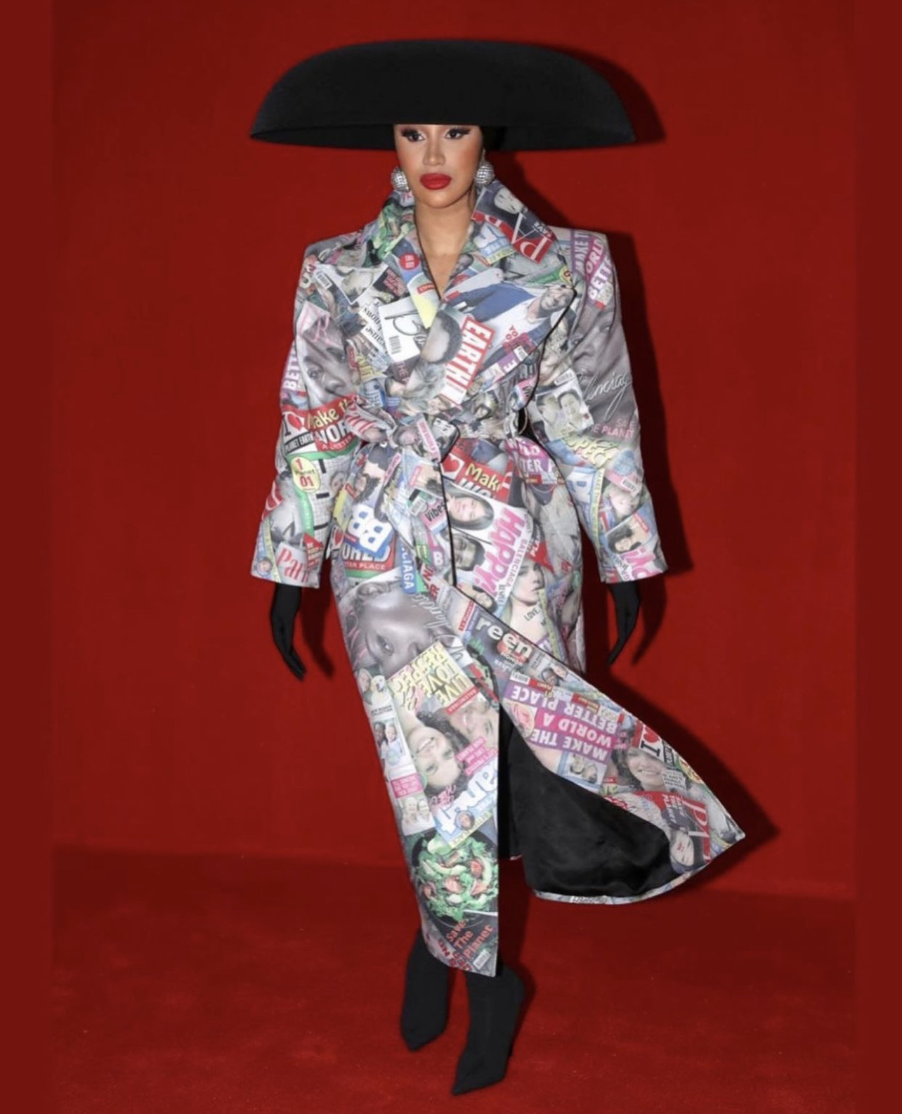 Cardi B attended the Balenciaga Summer 2022 show wearing the the brand’s Spring 2020 tabloid trench coat. She paired the magazine print coat with other pieces from Balenciaga including a Fall 2021 Couture black hat, gloves, sock boots, and earrings.