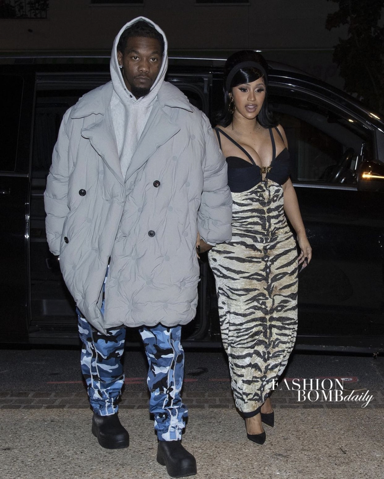Cardi B stepped out with Offset wearing another look by Roberto Cavalli, styled by Kollin Carter. She finished the look with a black headband and $745 Louboutin So Kate black suede pumps.