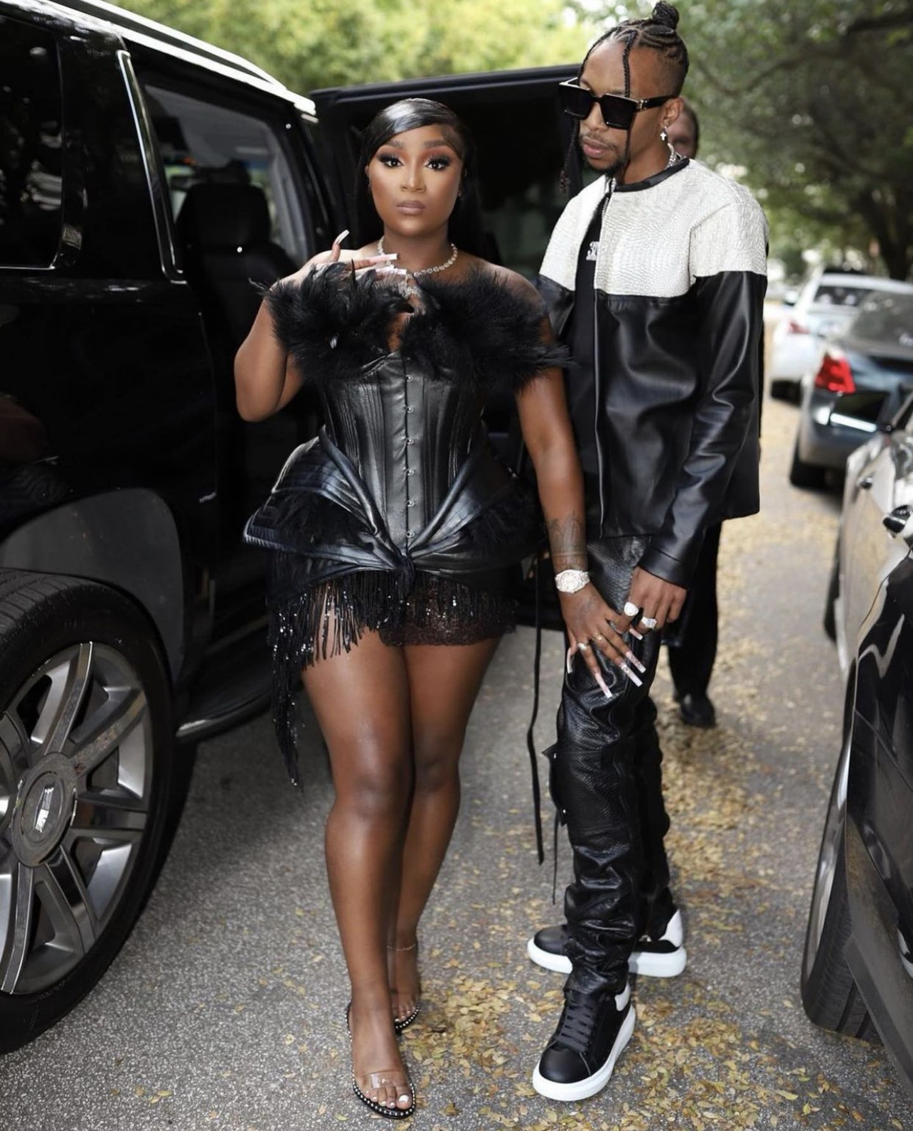 Erica Banks was spied in a Jock Monocc custom black feather and fringe-embellished leather dress, styled by SuperDope Q.