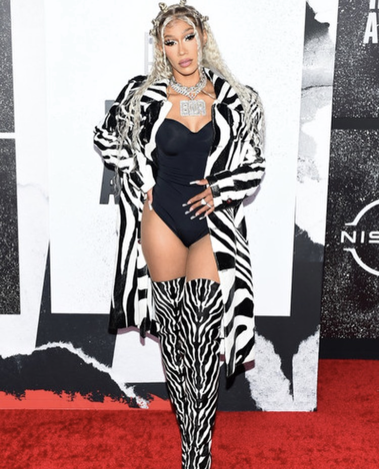 Latto wore a look by JW Anderson including the $1,250 cropped wraparound peak lapels blazer and $920 wide leg tuxedo trousers which were tailored into shorts by Brently Pearson. She completed the look with Giuseppe Zanotti platform heels. Her look was styled by Todd White.