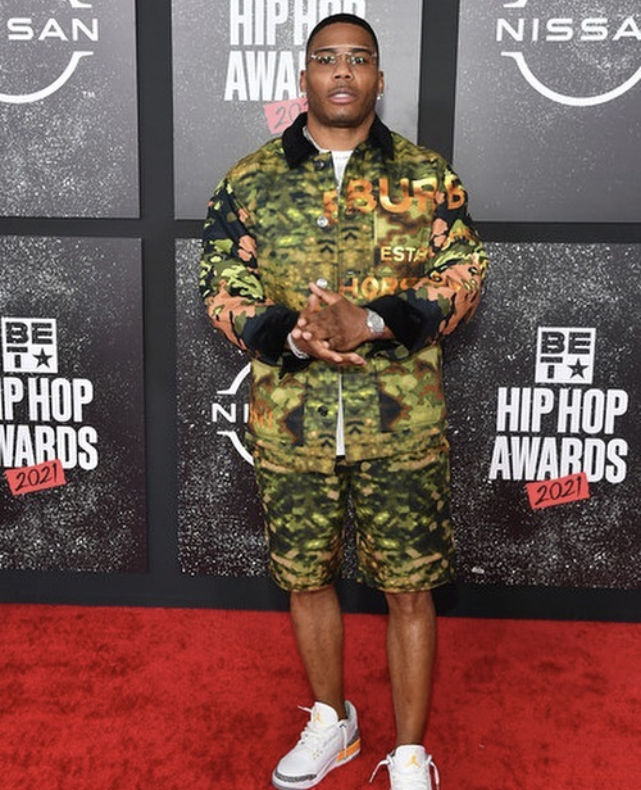Nelly wore a Burberry look including the brand’s $2,190 camo print jacket and $480 swim shorts. He also wore a pair of the Air Jordan 3 “Laser Orange” sneakers.