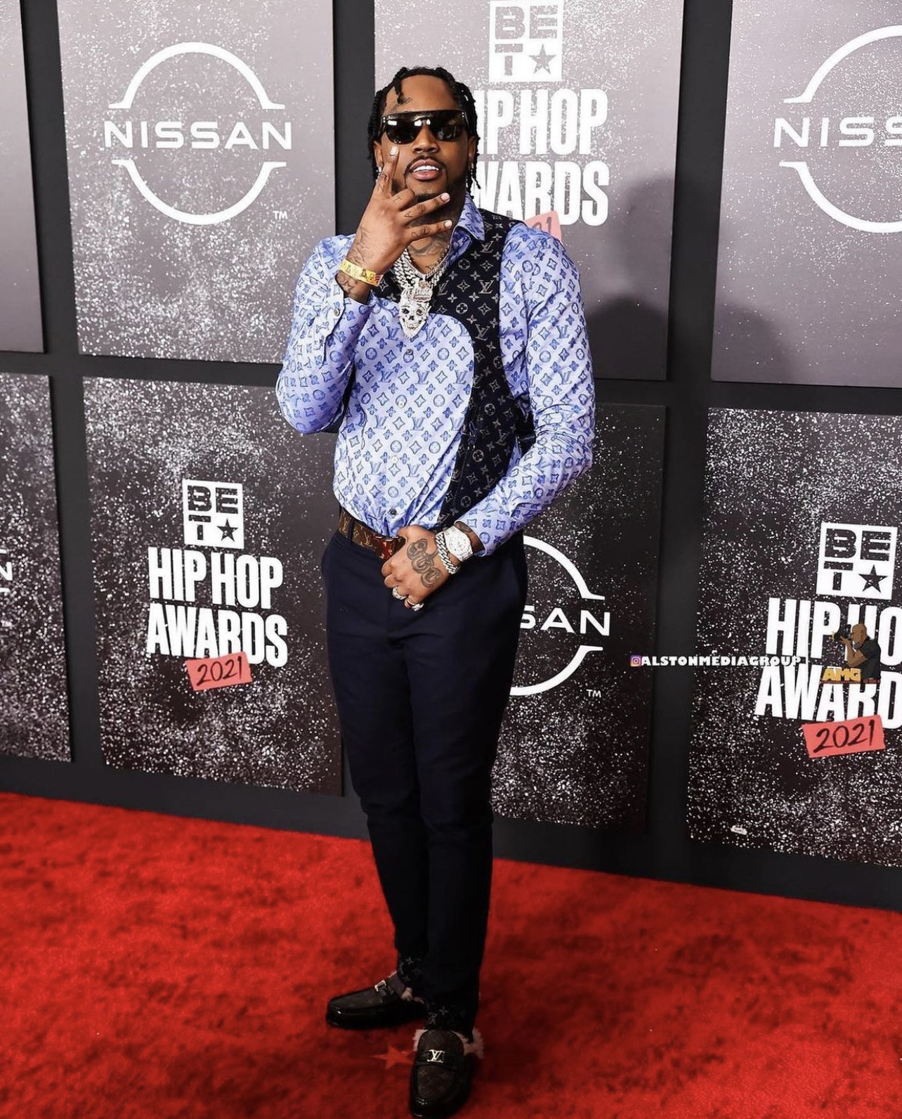 Fivio Foreign wore Louis Vuitton, including a $945 logo shirt and $2,530 fabric harness, to the BET Hip Hop Awards. He continued the Louis Vuitton aesthetic with monogram fur loafers and a belt by the brand.