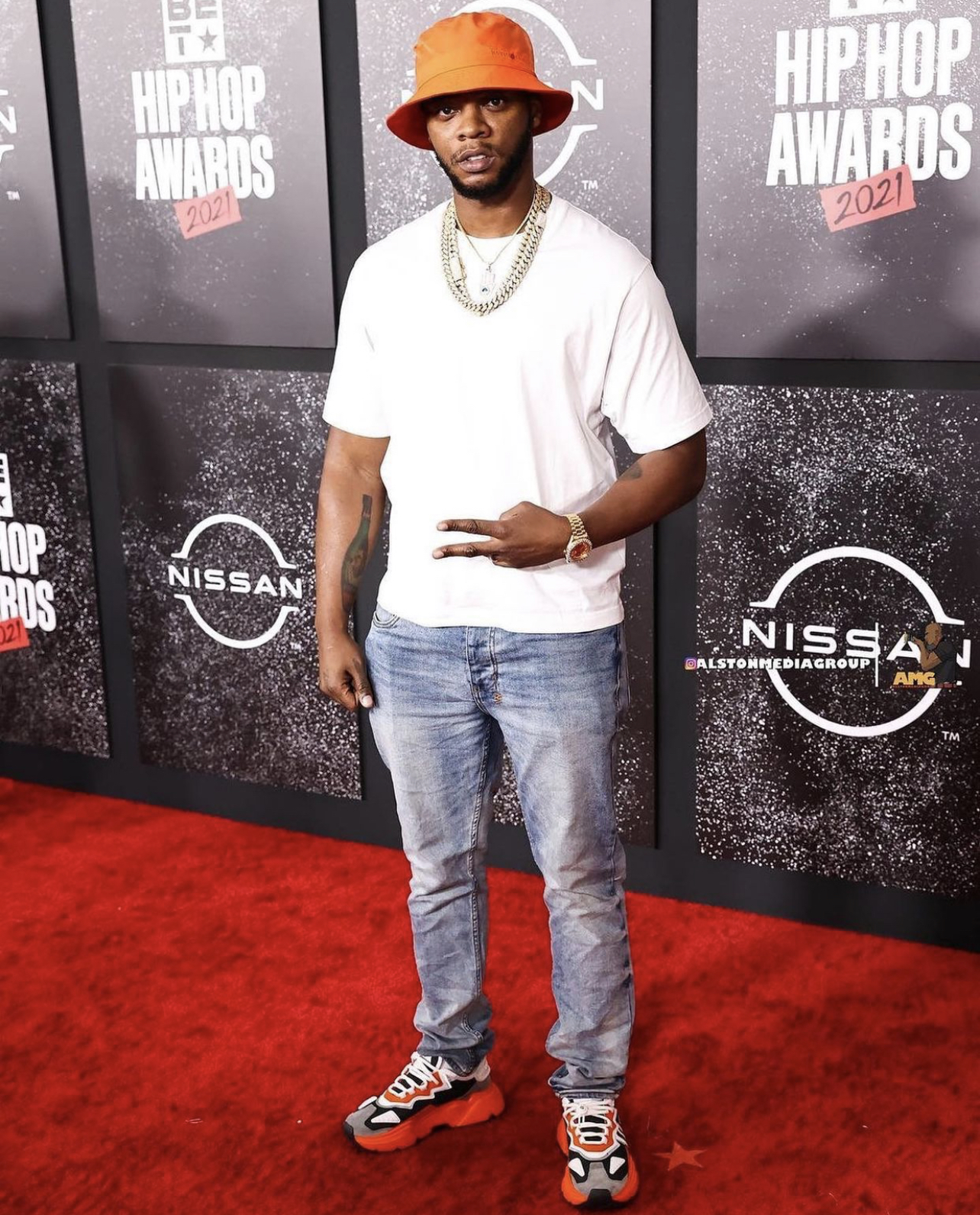 Papoose opted for a classic white t-shirt, jeans, and sneakers for his award show look. He also sported an orange bucket hat and chains for his accessories.