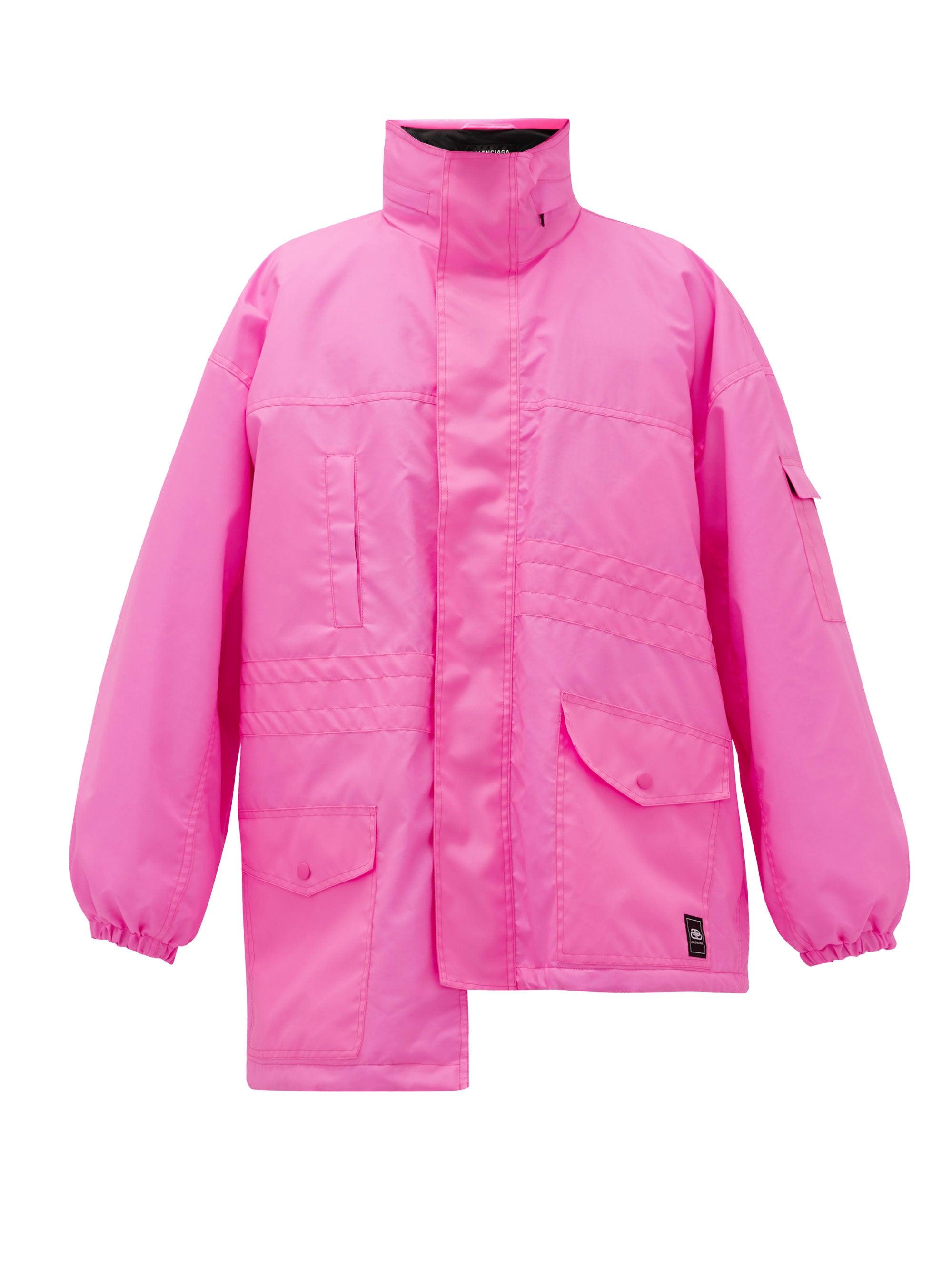 Kim Kardashian was outfitted in Balenciaga’s Resort 2020 neon pink asymmetrical puffer coat, which may have been customized and extended to a maxi-style for her. For accessories, she wore more Balenciaga pieces including the black oversized rectangular sunglasses, crystal-adorned Hourglass tote bag, Knife sequin boots (going for $932 on 1st Dibs), and pink velvet gloves. She finished the look with a pair of dazzling crystal earrings.