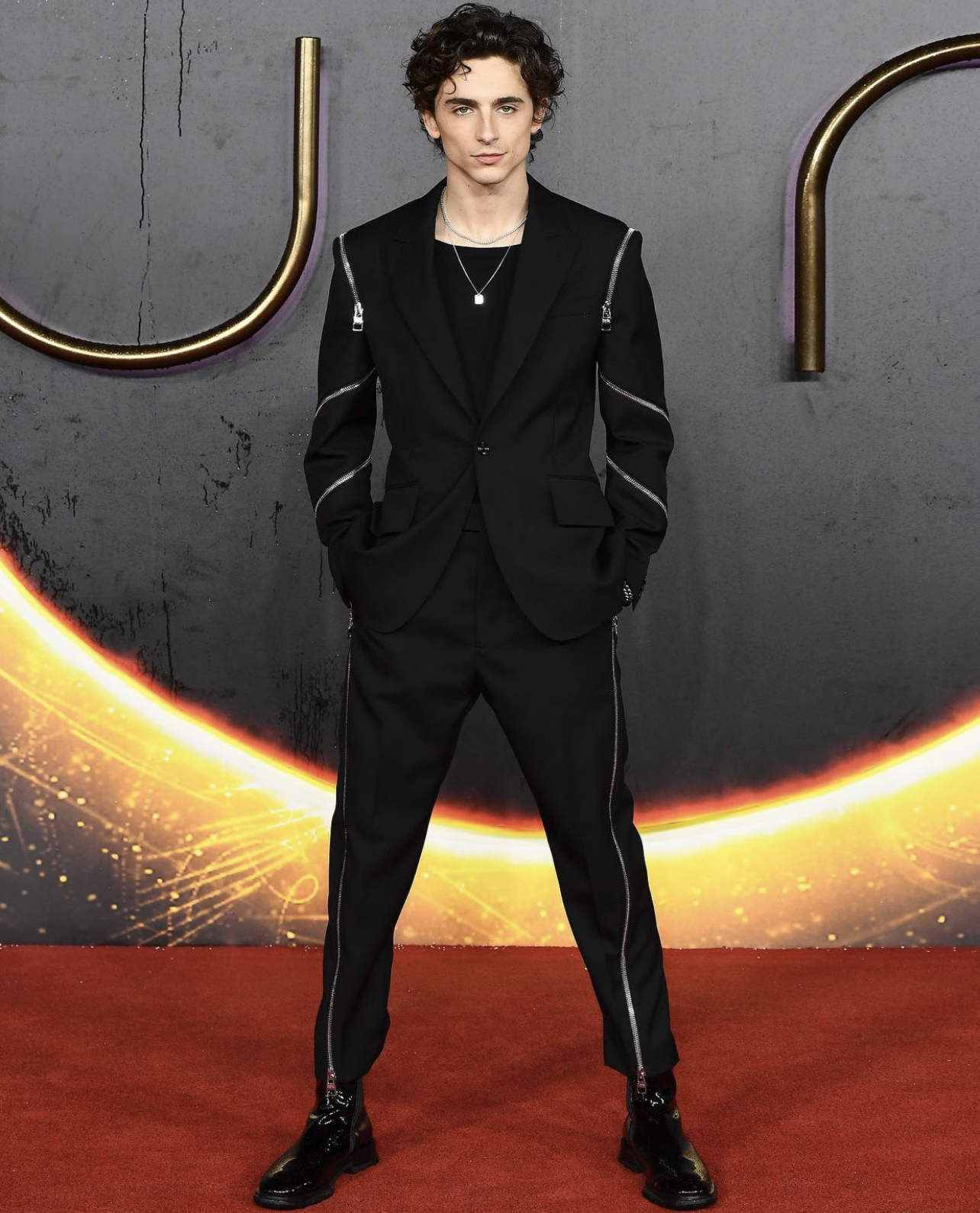 Timothée Chalamet wore an Alexander McQueen Spring 2022 suit for the film’s exclusive London screening. His look included a single-breasted jacket and trousers with zip details throughout each piece. He completed the look with black boots and a necklace.
