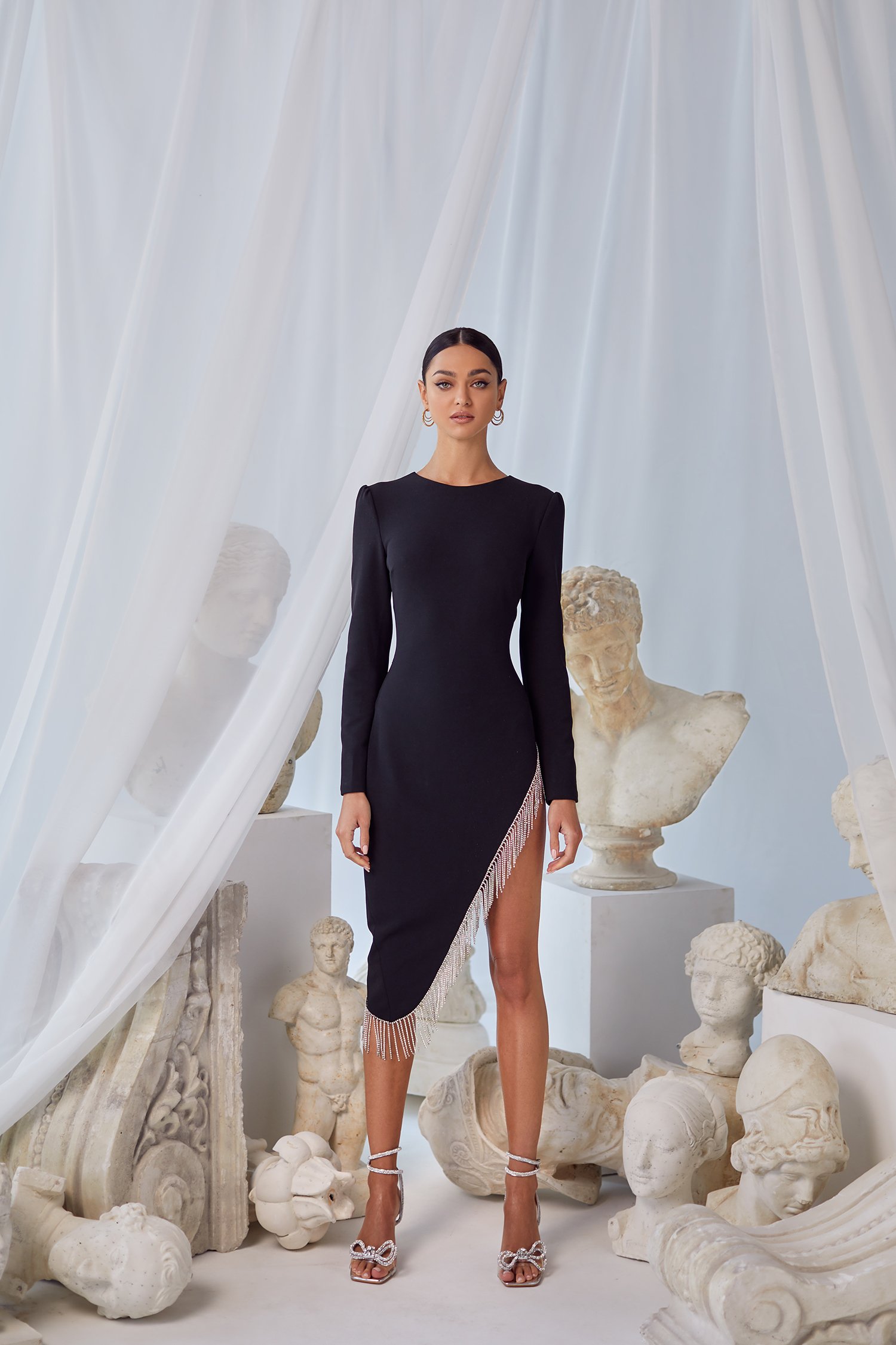 Serena Williams wore the $306 Alamour “Gilda” black asymmetrical crystal-embellished dress, styled by Kesha McLeod. The dress was paired with $35.50 Nude Barre fishnet tights and jewelry pieces from her Serena Williams Jewelry line. In another pic, Williams was seen in a pair of Nike sneakers while rocking her dress.