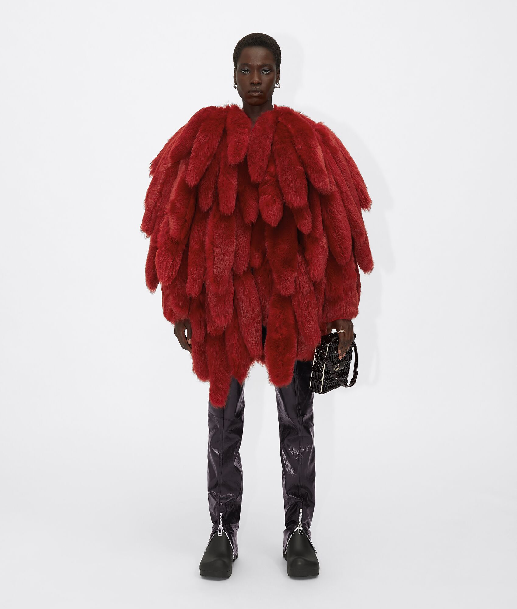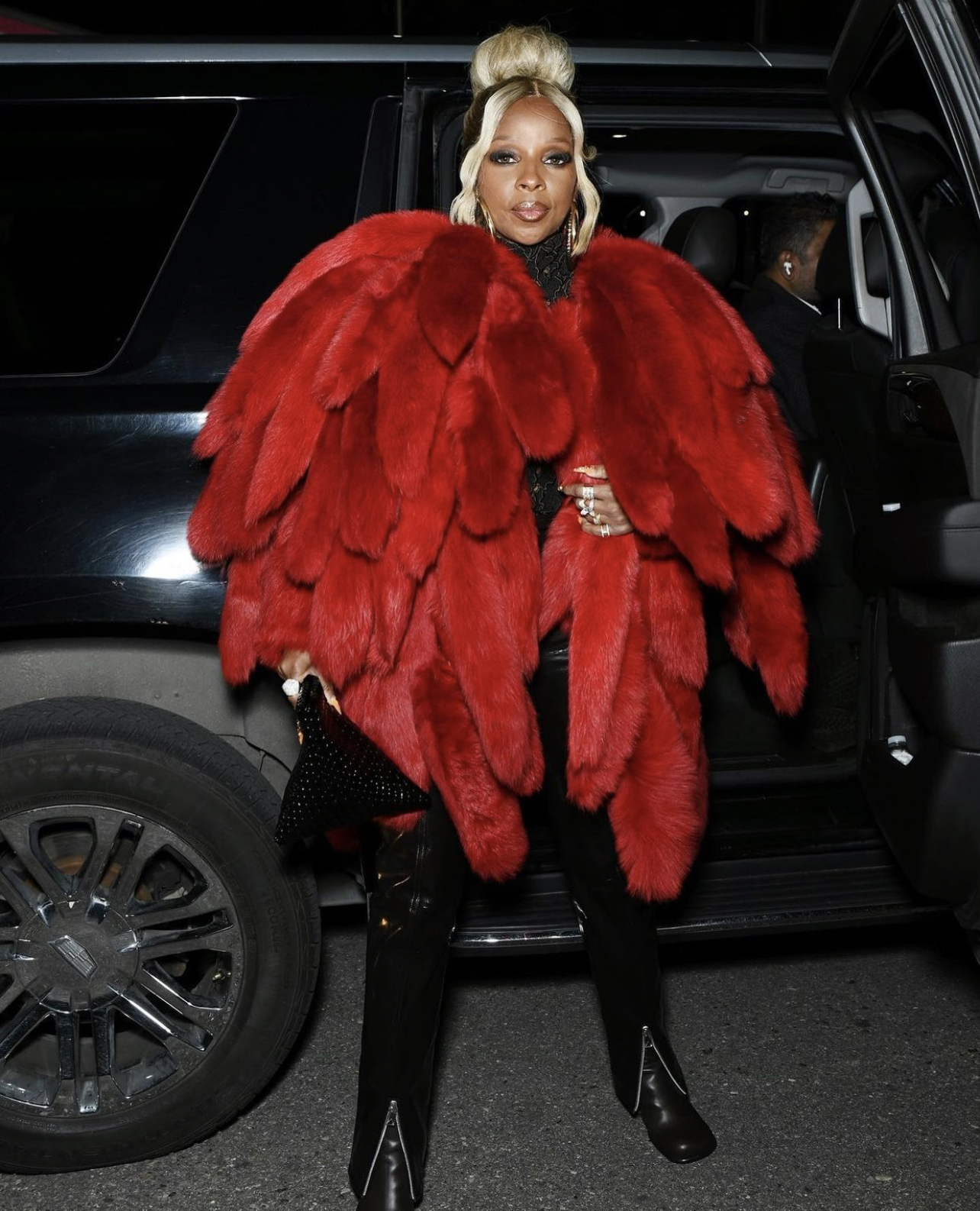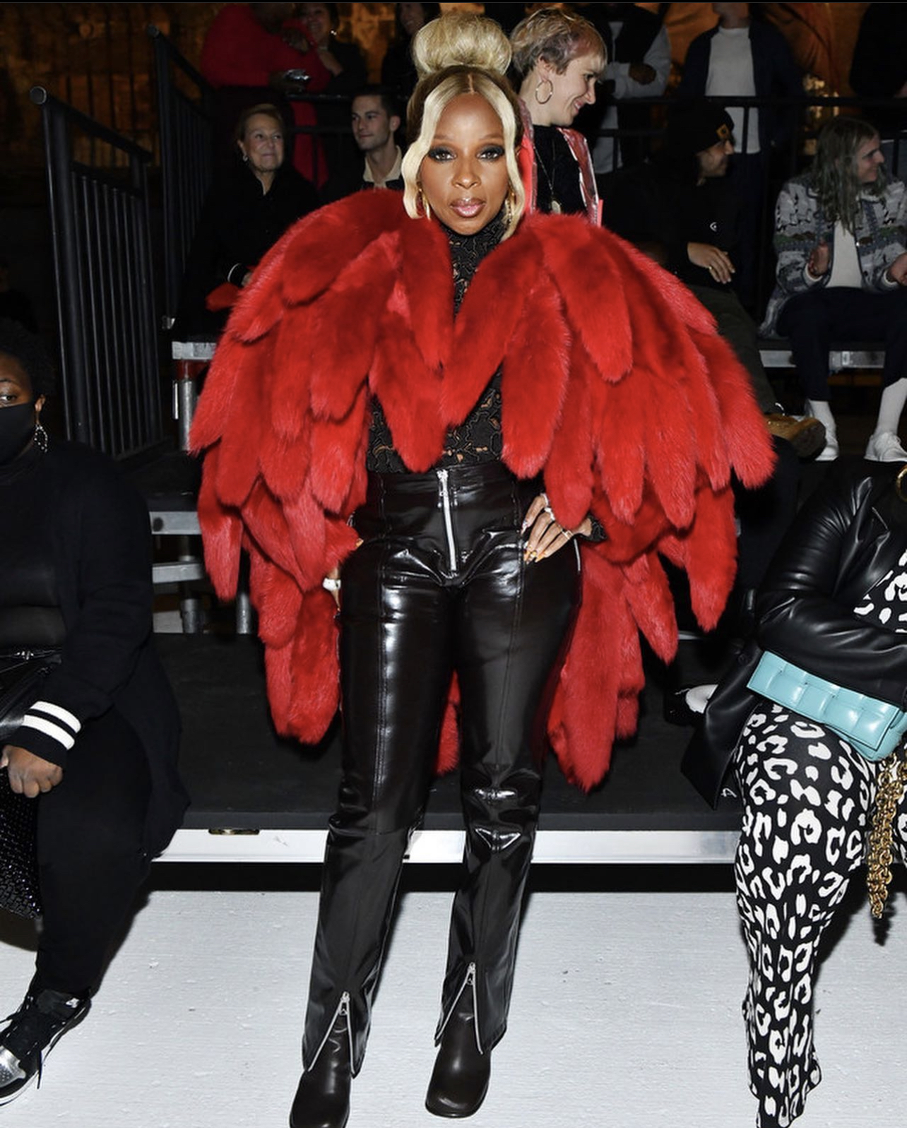 Mary J. Blige Dons Bottega Veneta Red Shearling Padded Tails Coat, Black Zipper-Detail Leather Pants, and Black Floral Embroidery Top to the Brand’s Salon 03 Show in Detroit