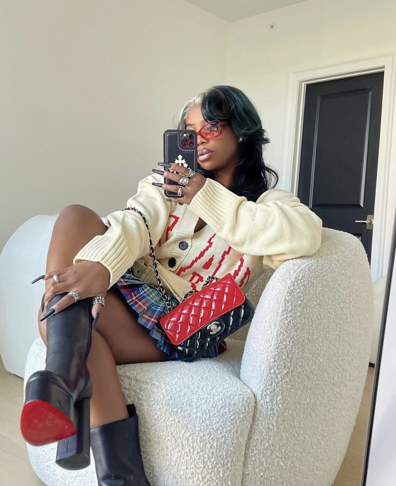 The fashionista rocked a $160 cream Vale cardigan paired with a flirty Loverboy by Charles Jeffrey mini kilt. To add to the stylish look, she accessorized with black Christian Louboutin Izamayeah 130 platforms and a $5,800 Chanel Cruise 2020 black and red patent handbag (sold out).
