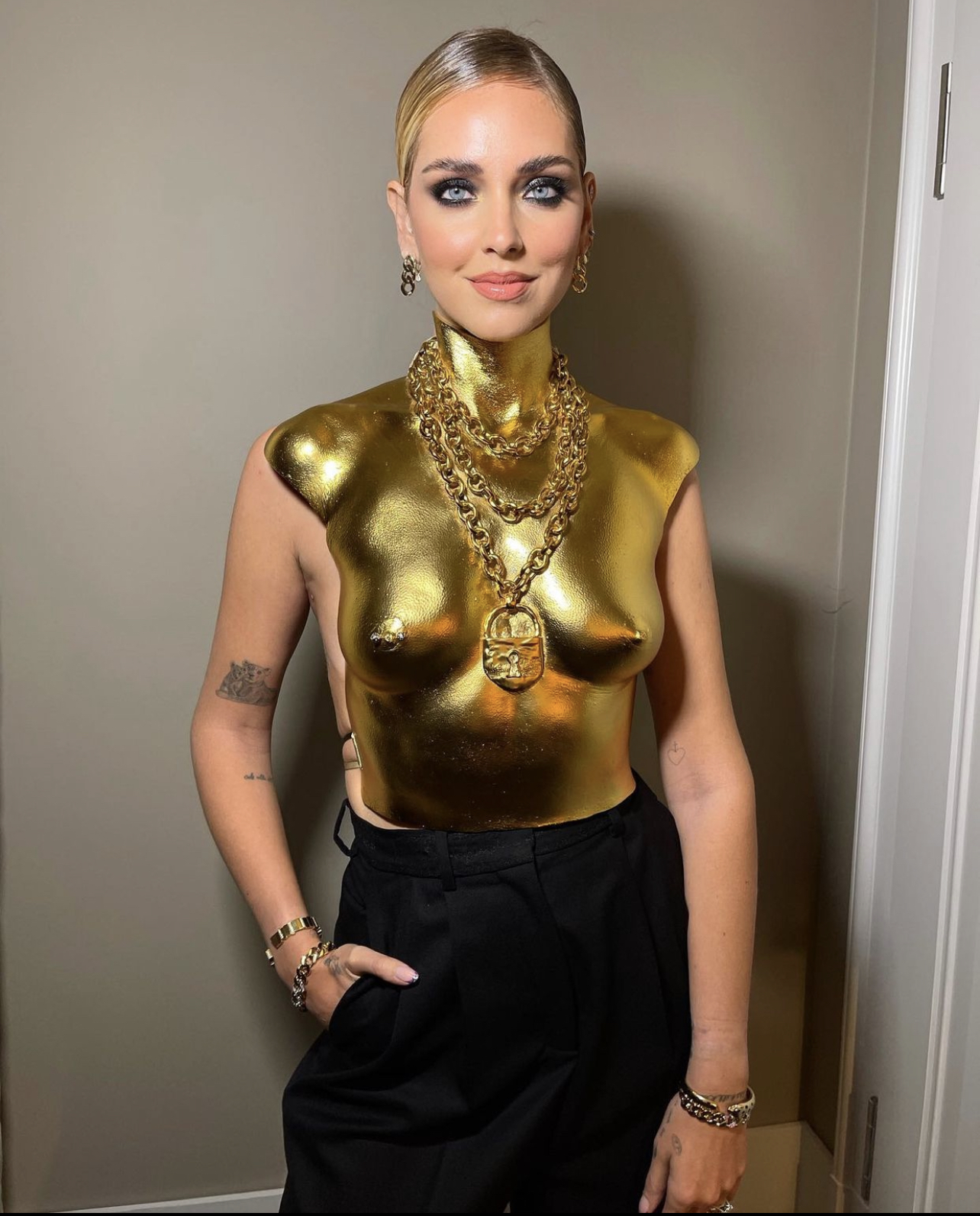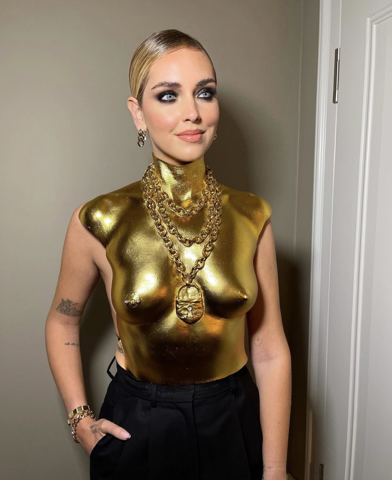 Ferragni wore a look from Schiaparelli’s Spring 2021 Haute Couture collection titled “Second Skin”. The ensemble included a golden gilded bust comprised of resin with a padlock necklace, black wool wide leg trousers, and black satin pumps with golden toes and silver nails.