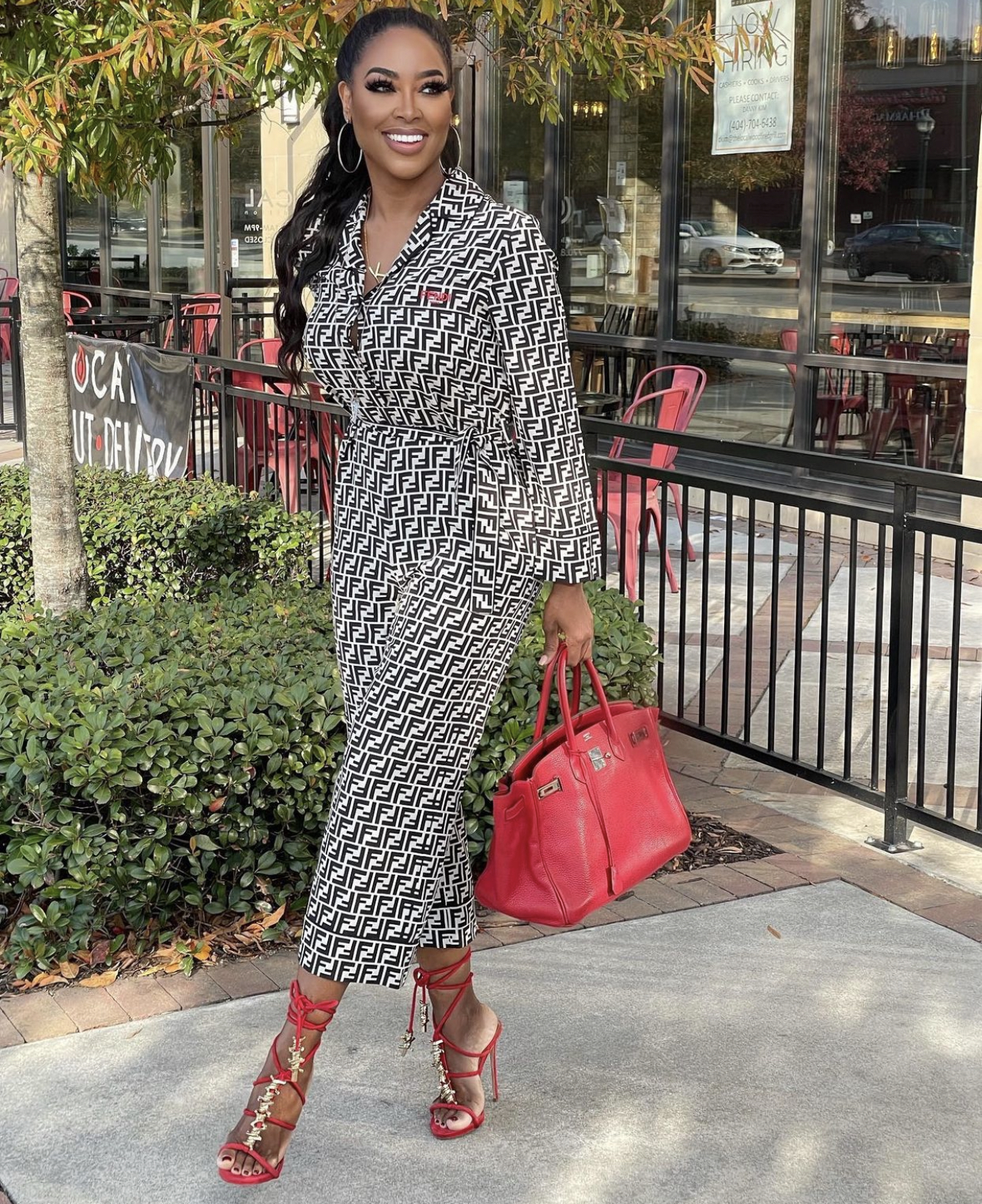 Kenya Moore wore a completely sold-out look including a $2,985 Fendi “FF” logo belted silk jumpsuit, which also has been spotted on Mary J. Blige and Fergie, paired with a red Hermès Birkin handbag and Dsquared2 “Babe Wire” lace-up sandals. She finished the look with a pair of hoop earrings and a wavy ponytail.