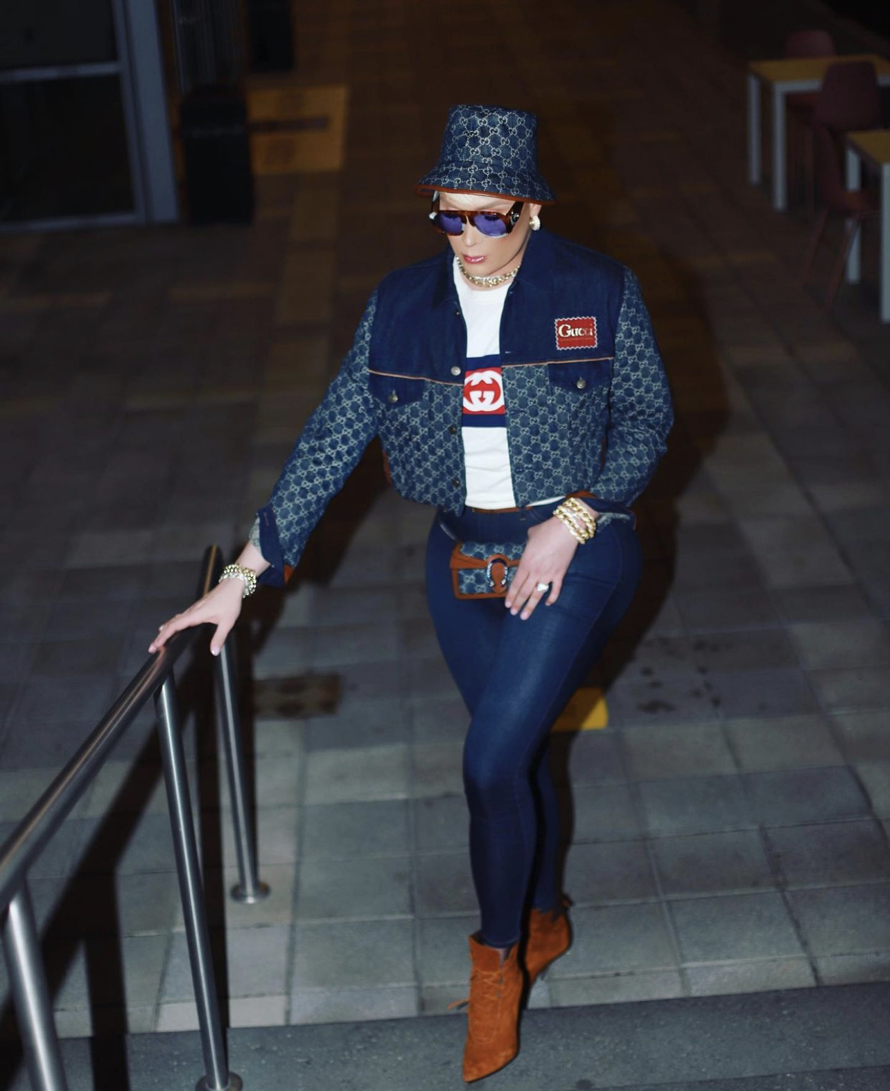 Paris Chea wore a $2,600 Gucci eco washed organic denim jacket paired with jeans. The look was accessorized with other Gucci pieces including a blue and red logo white t-shirt, sunglasses, $590 GG canvas bucket hat, and $930 Dionysus super mini bag. The stylist also rocked $275 Good American “Scandal” booties.