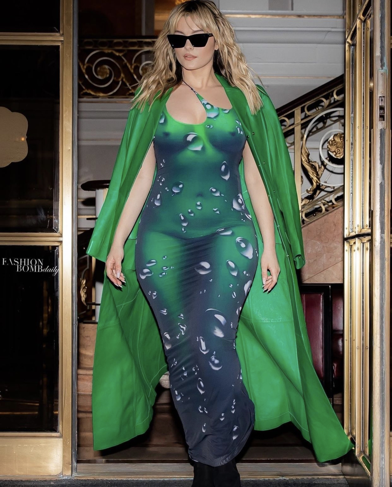 Bebe Rexha wore the Syndical Chamber by Sergio Castaño Peña “Chemical” dress which features the print of a female’s body with large water drops allover. The green dress was paired with a Ferragamo Fall 2021 green leather trench coat, black boots, and sunglasses. Her look was styled by Sam Woolf.