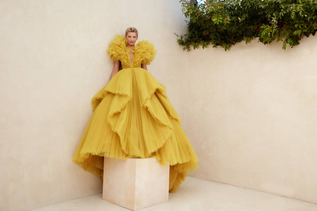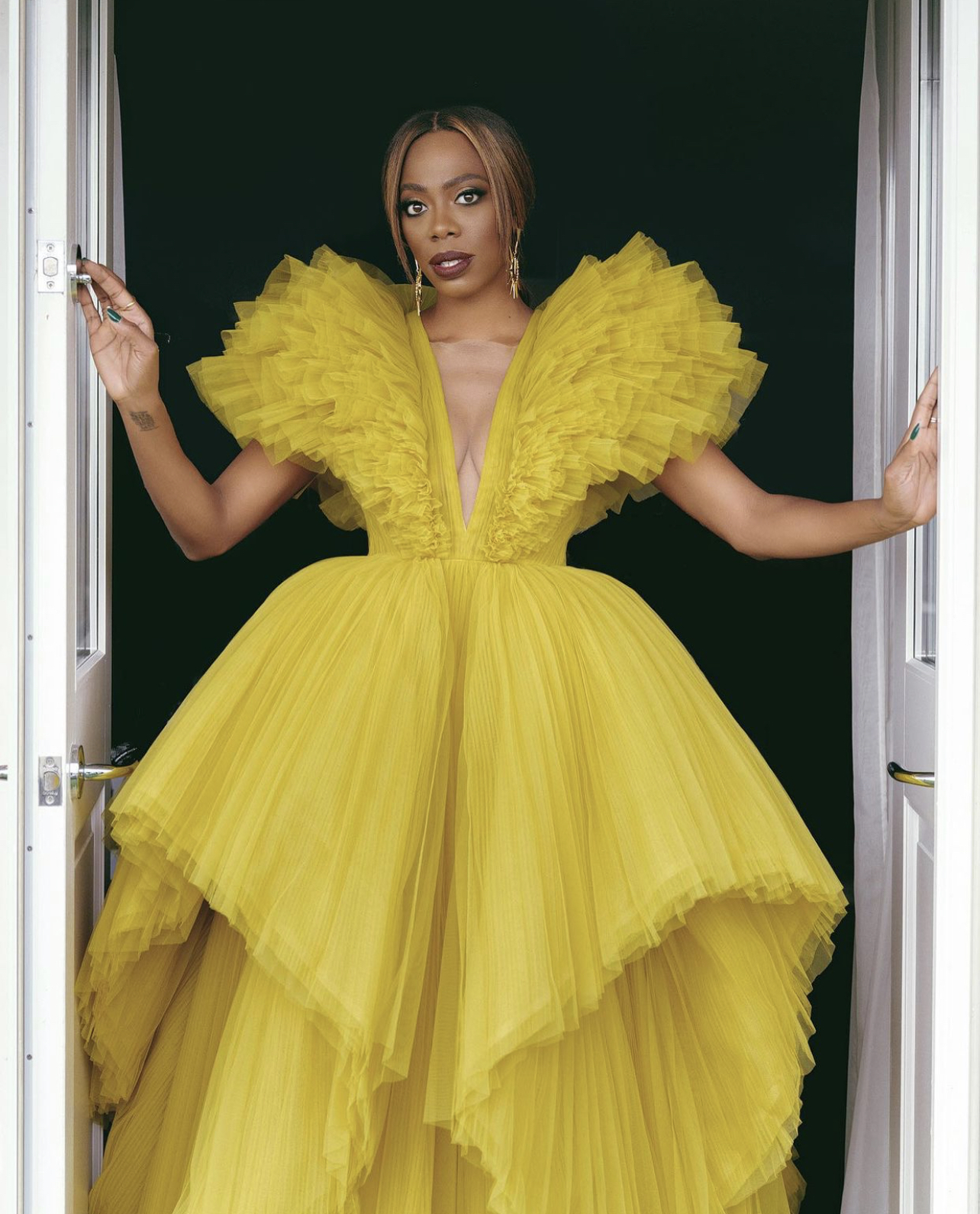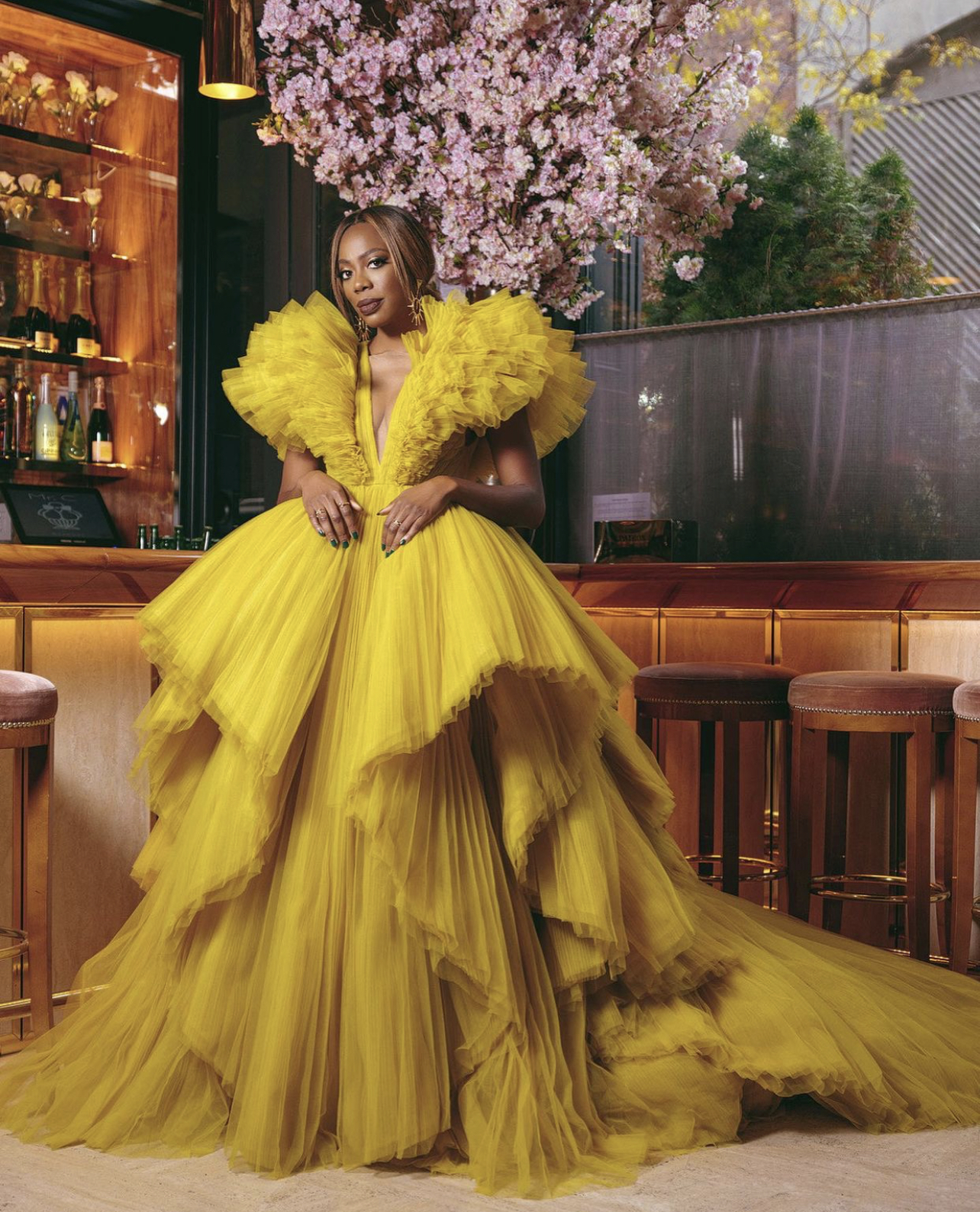 Yvonne Orji wore a Nicole and Felicia Spring/Summer 2022 marigold tulle gown, styled by Apuje Kalu. The eye-catching dress was paired with sun earrings by Earring Envy. To go along with the look, she wore her hair in a braided ponytail, executed by Johnny Wright.