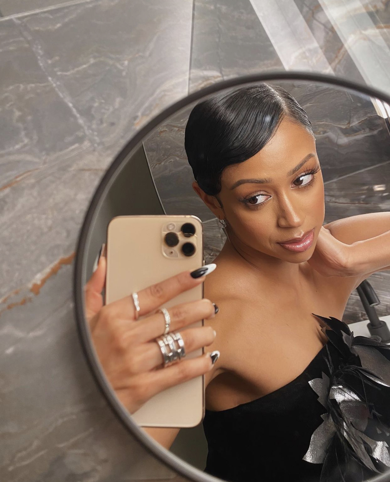 Liza Koshy wore a Haleia Fall 2021 Couture $665 flower and feather decorated bustier and $830 velvet flared-leg pants, giving us all the feels of 1920s-meets-modern glam. The look was completed with black Christian Louboutin platform heels and Melinda Maria jewelry. Her look was styled by Alexandra Mandelkorn.