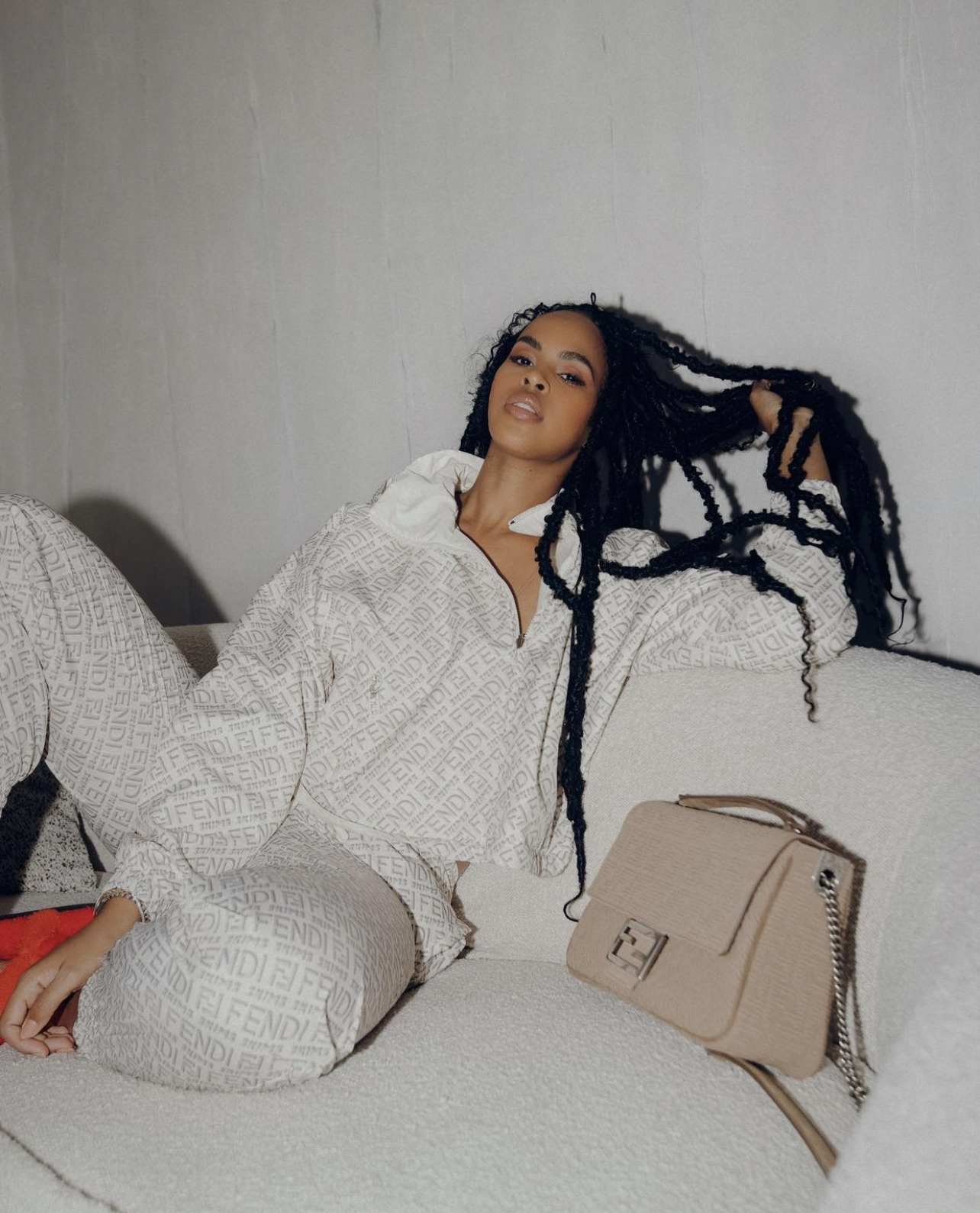 Following a rather neutral color palette matched with a pop of pink, the well-known Fendi “FF” monogram finds itself throughout the collection, stamped on pieces such as jumpsuits, puffer jackets, tights, and more. Lala, Coi Leray, Sabrina Elba were fans of this collaboration.