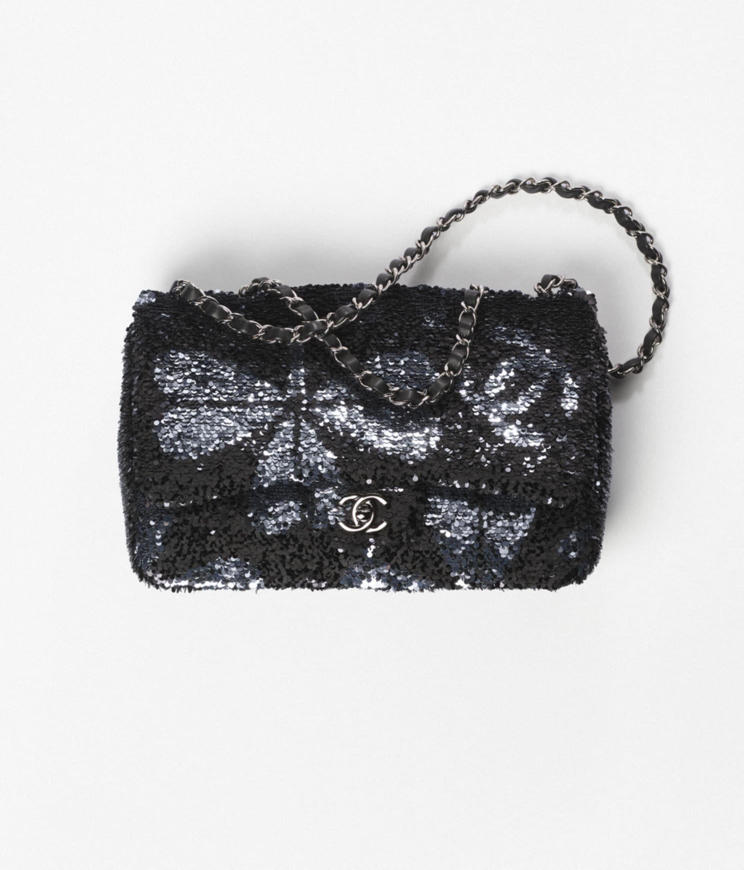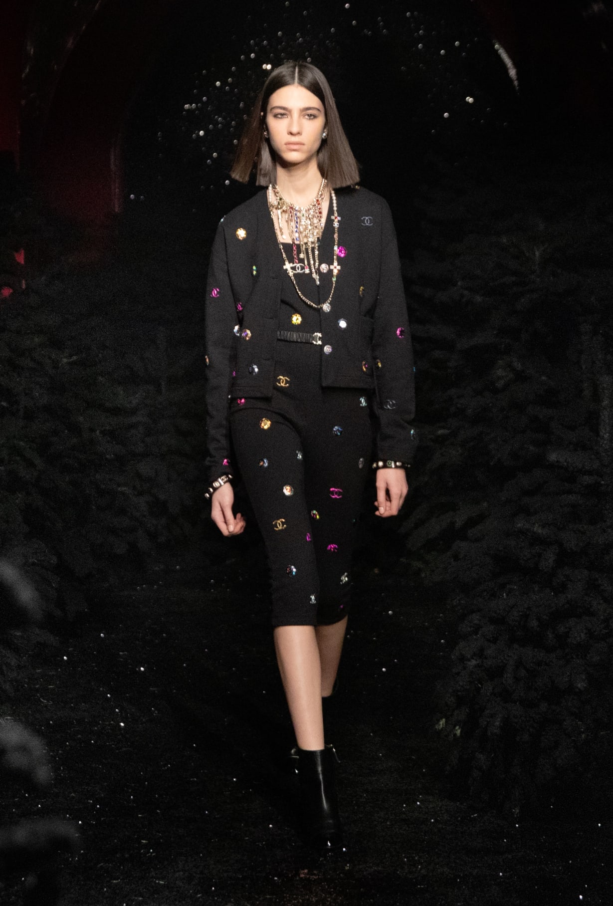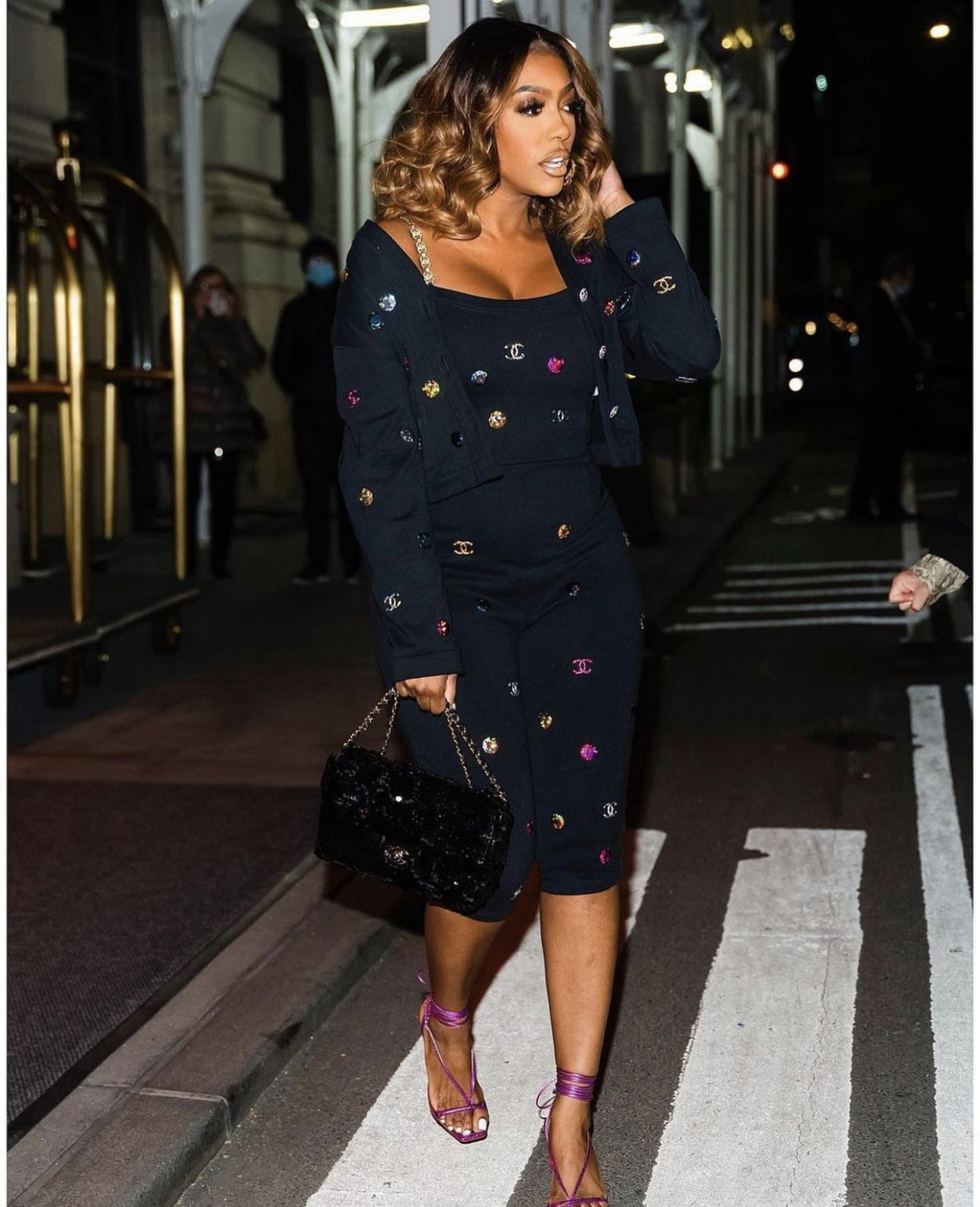 Porsha Williams wore a Chanel Fall 2021 RTW look including a $4,350 black embellished cardigan and $6,500 chain-straps jumpsuit. The look was completed with a $6,300 Chanel black and silver sequin handbag and pink metallic lace-up thong sandals. Her outfit was styled by Jeremy Haynes.
