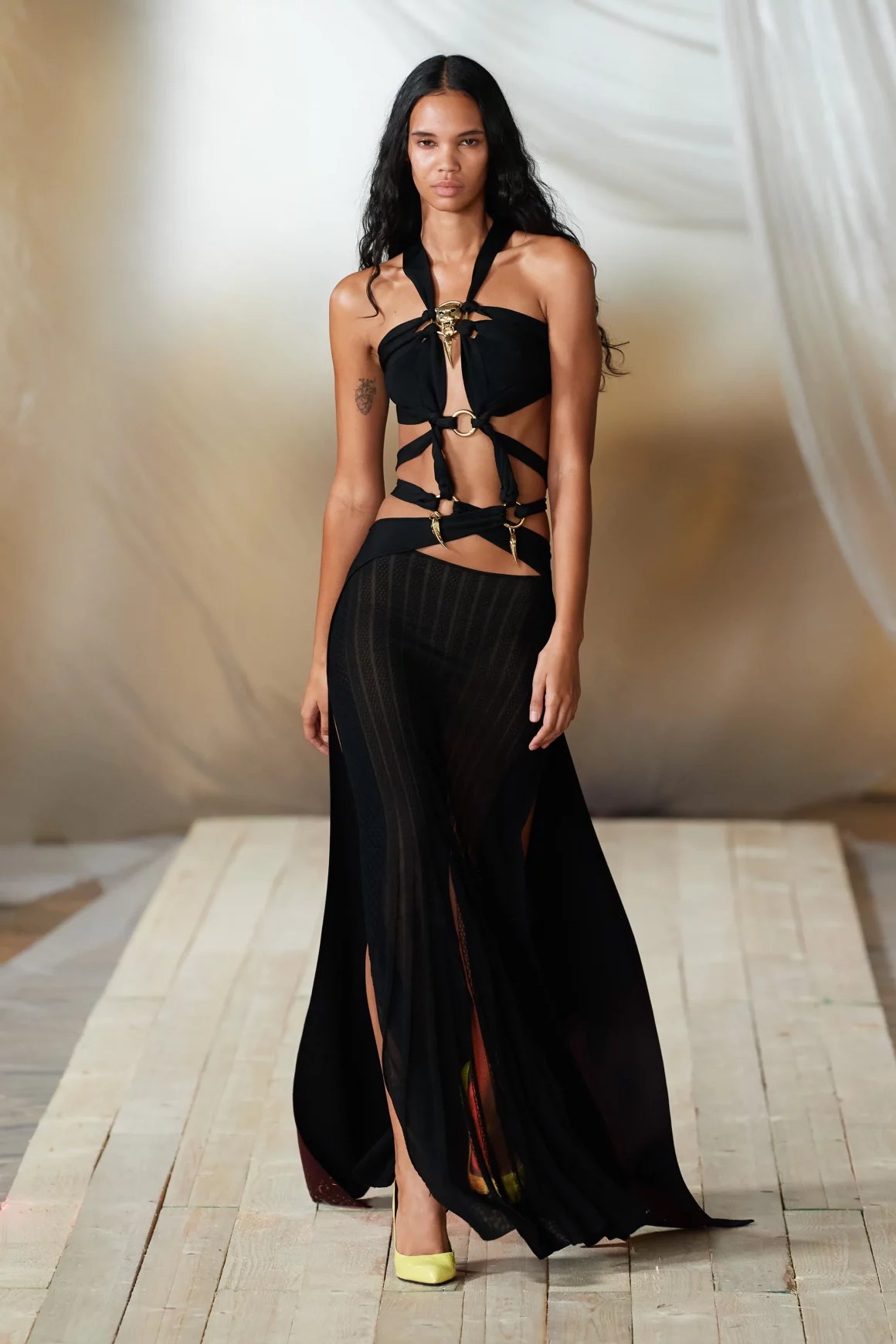 For the “Good Morning Gorgeous” artwork, she wore a Roberto Cavalli Spring 2022 black cutout o-ring detail maxi dress. The look was rounded off with Jennifer Fisher hoop earrings and gold bracelets.