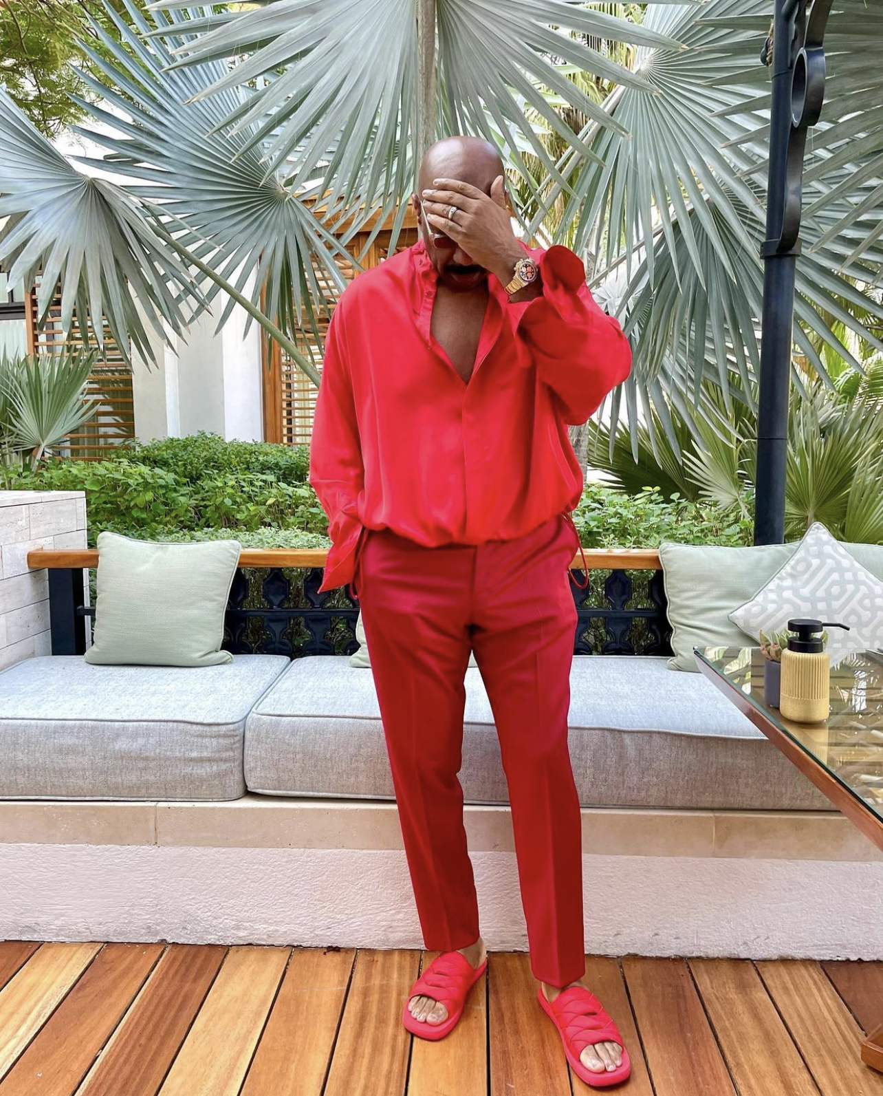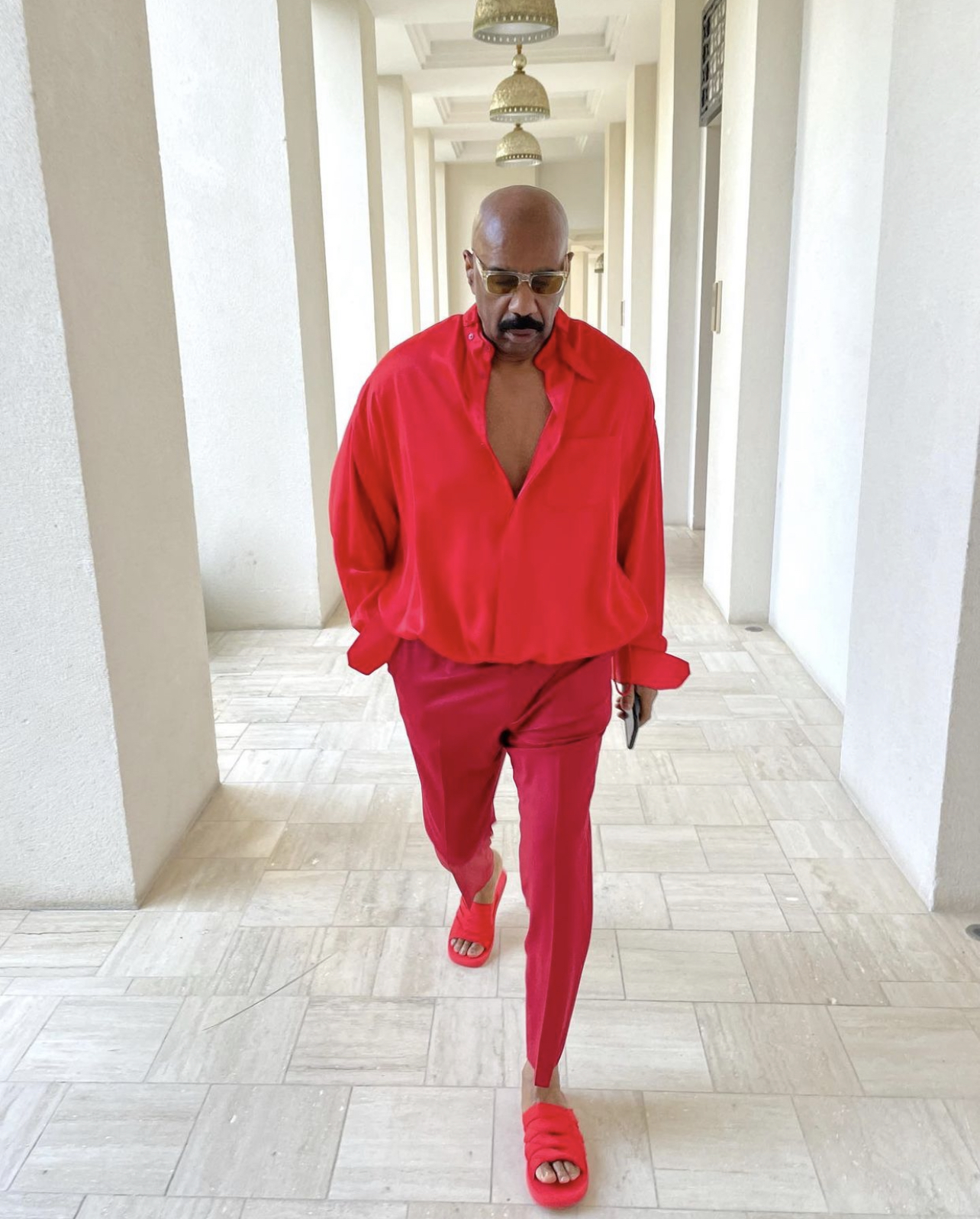 Steve Harvey wore a Louis Vuitton Spring 2019 red shirt and trousers, styled by Elly Karamoh. Karamoh pulled this look together with the intention of honoring the late designer Virgil Abloh. This look worn by Harvey comes from the Spring/Summer 2019 collection which was his first collection and show as Louis Vuitton’s creative director for its menswear line. Karamoh expressed in an Instagram post, “The Spring 2019 Louis Vuitton collection was the start of a new generation coming into its own. RIP Virgil Abloh.“