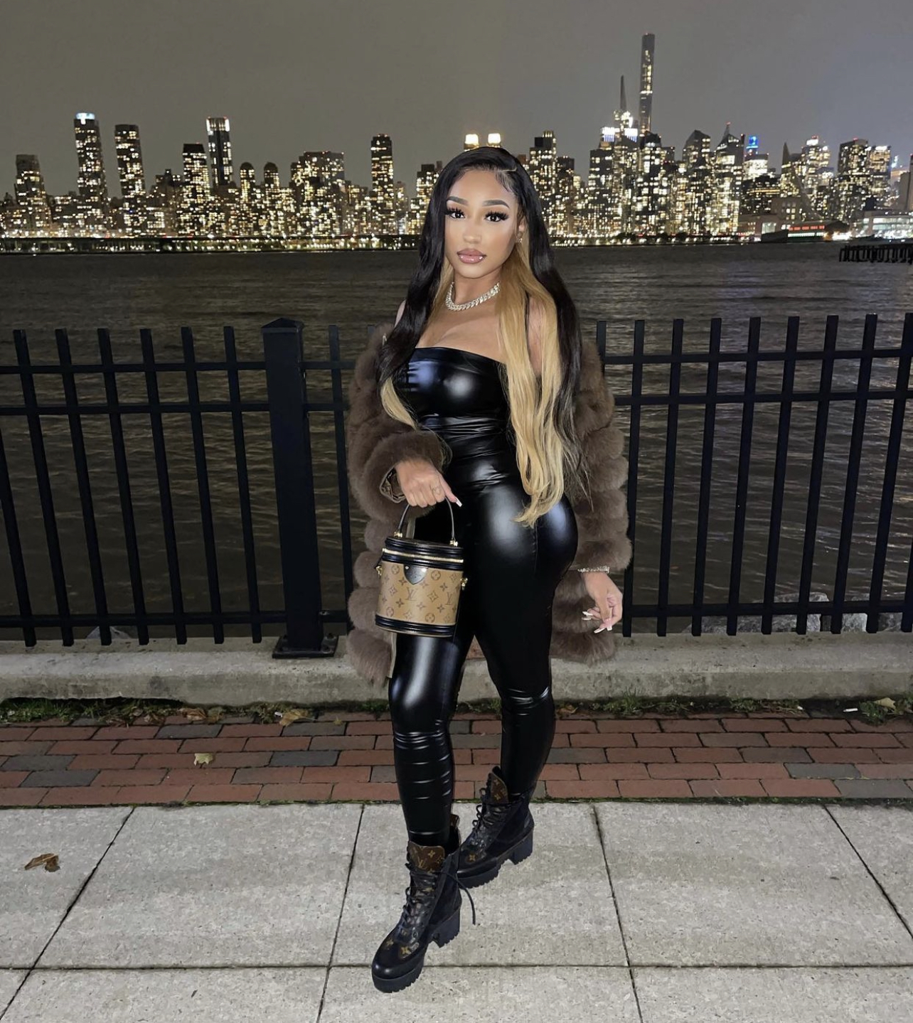 Ella Rodriguez wore Fashion Nova’s $29.99 Buenos Aires PU Jumpsuit in black. She paired the jumpsuit with a brown fur coat along with Louis Vuitton boots and a handbag.